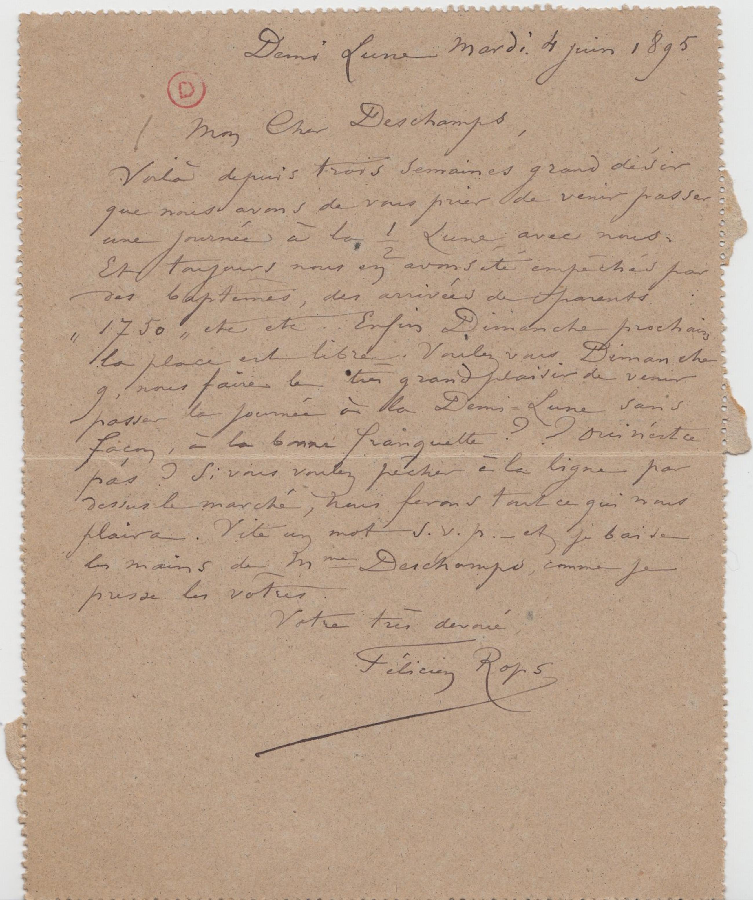 Voilà depuis trois semaines grand désir que nous avons de vous prier de venir passer une journée à la ½ Lune avec nous. Et toujours nous en avons été empêchés par des baptêmes, des arrivées de parents « 1750 » etc etc.. Enfin Dimanche prochain la place est libre. Voulez vous Dimanche 9, nous faire le très grand plaisir de venir passer la journée à la Demi-Lune sans façon, à la bonne franquette ?? Oui n’est ce pas ? Si vous voulez pêcher à la ligne par dessus le marché, nous ferons tout ce qui nous plaira. Vite un mot s.v.p. – et je baise les mains de Mme Deschamps, comme je presse les vôtres.