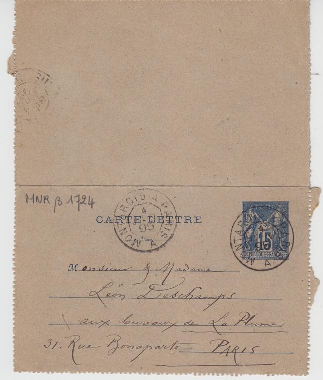 Monsieur & Madame Léon DeschampsAux bureaux de La Plume31. Rue BonapartePARIS Page 1 Verso : 2