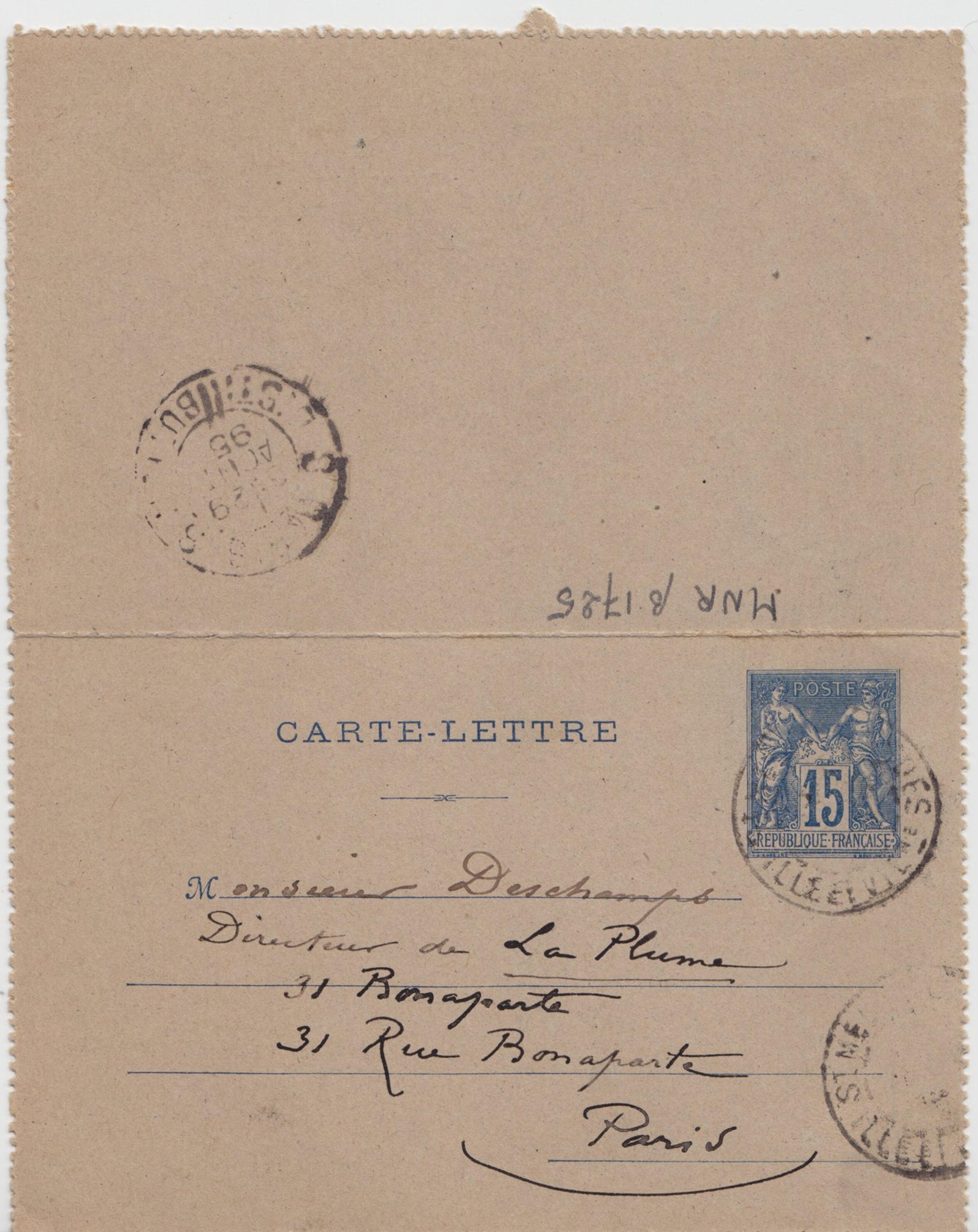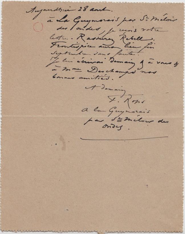 À La Guymorais par St Méloir des Ondes, je reçois votre lettre. Rassurez Rebell. Frontispice aura lieu fin septembre sans faute. Je lui écrirai demain & à vous & à Mme Deschamps nos bonnes amitiés.