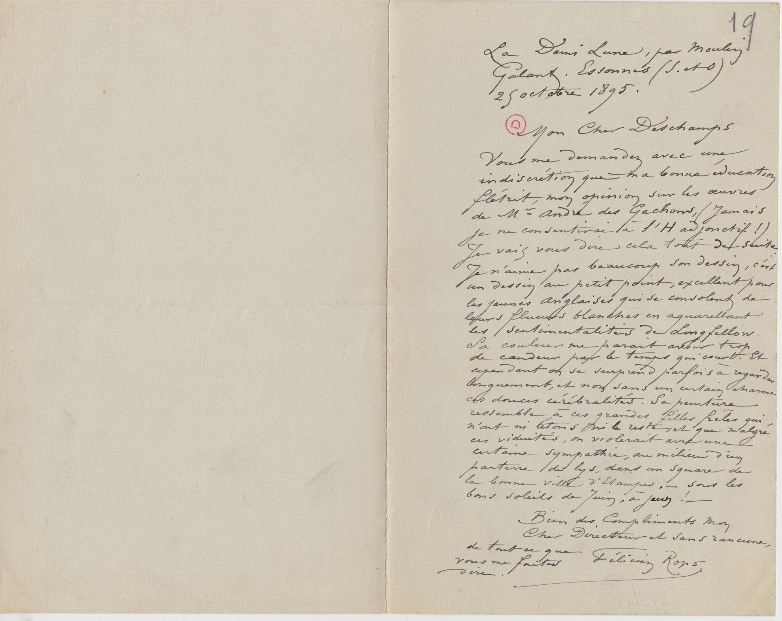 Vous me demandez avec une indiscrétion que ma bonne éducation flétrit, mon opinion sur les œuvres de Mr André des Gachons (Jamais je ne consentirait à l’H adjonctif !) Je vais vous dire cela tout de suite : Je n’aime pas beaucoup son dessin, c’est un dessin au petit point, excellent pour les jeunes Anglaises qui se consolent de leurs flueurs blanches en aquarellant les sentimentalités de Longfellow. Sa couleur me parait avoir trop de candeur par le temps qui court. Et cependant on se surprend parfois à regarder longuement, et non sans un certain charme ces douces cérébralités. Sa peinture ressemble à ces grandes filles frêles qui n’ont ni tétons ni le reste, et que malgré ces viduités, on violerait avec une certaine sympathie, au milieu d’un parterre de lys, dans un square de la bonne ville d’Etampes. – sous les bons soleils de Juin, à jeun ! –