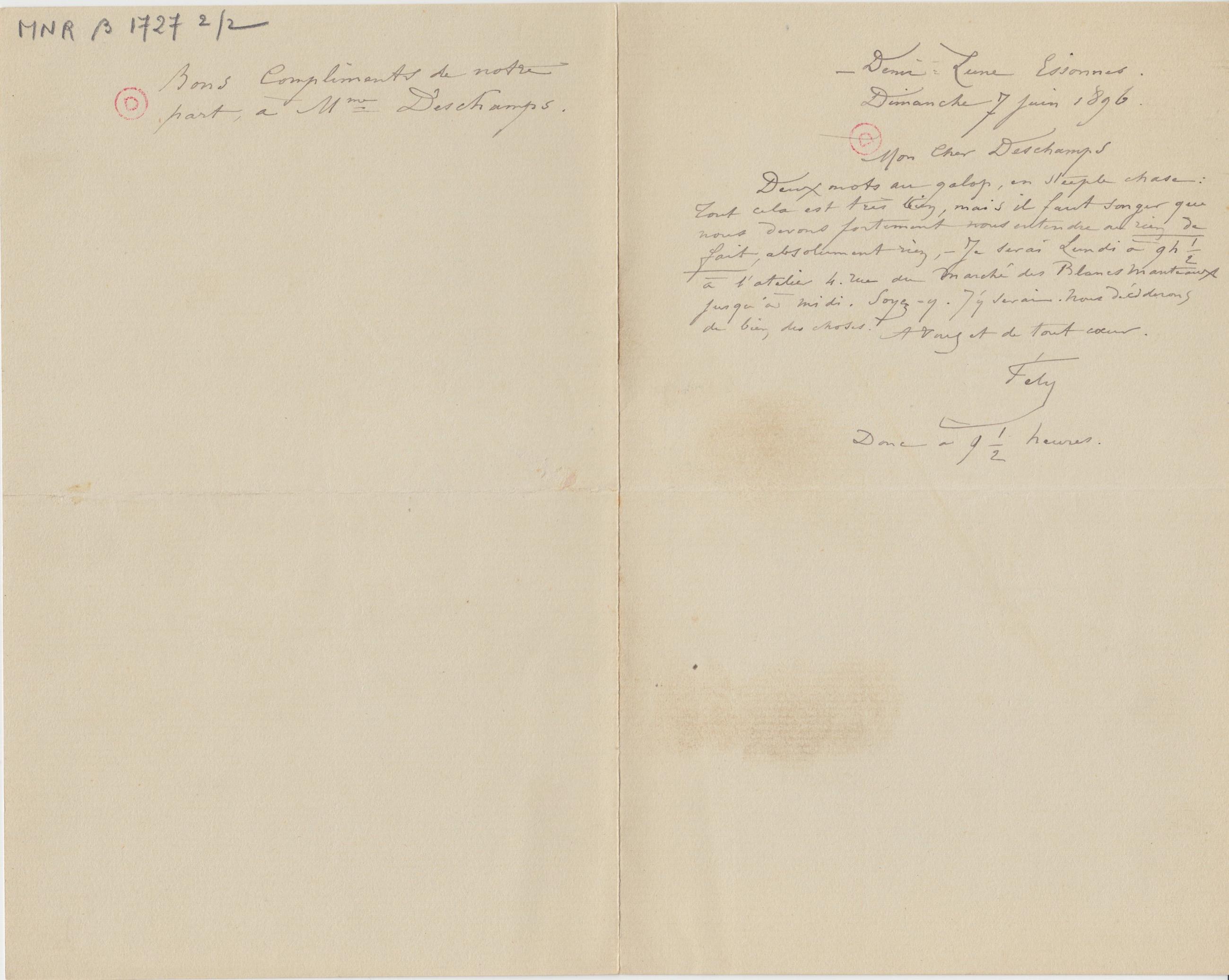 Tout cela est très bien, mais il faut songer que nous devons fortement nous entendre ou rien de fait, absolument rien, – Je serai Lundi à 9h ½ à l’atelier 4. rue du Marché des Blancs Manteaux jusqu'à midi. Soyez-y. J’y serai. Nous déciderons de bien des choses.