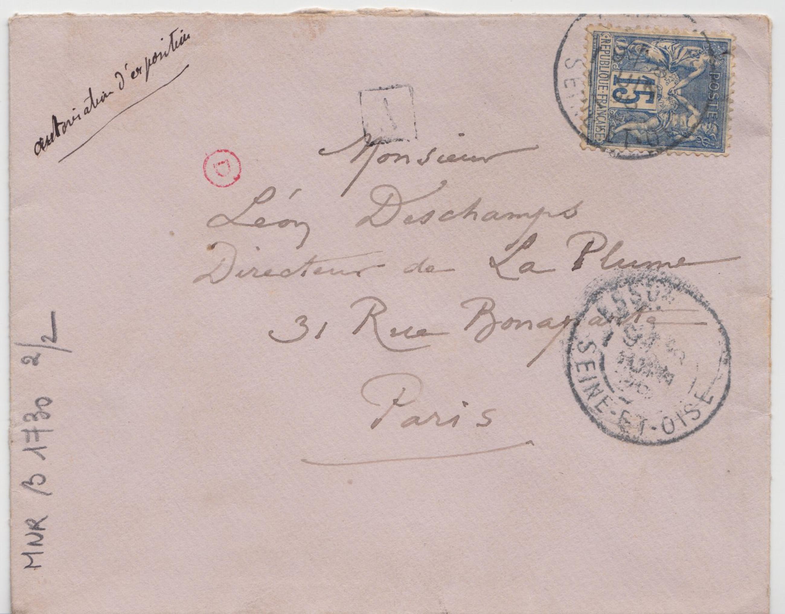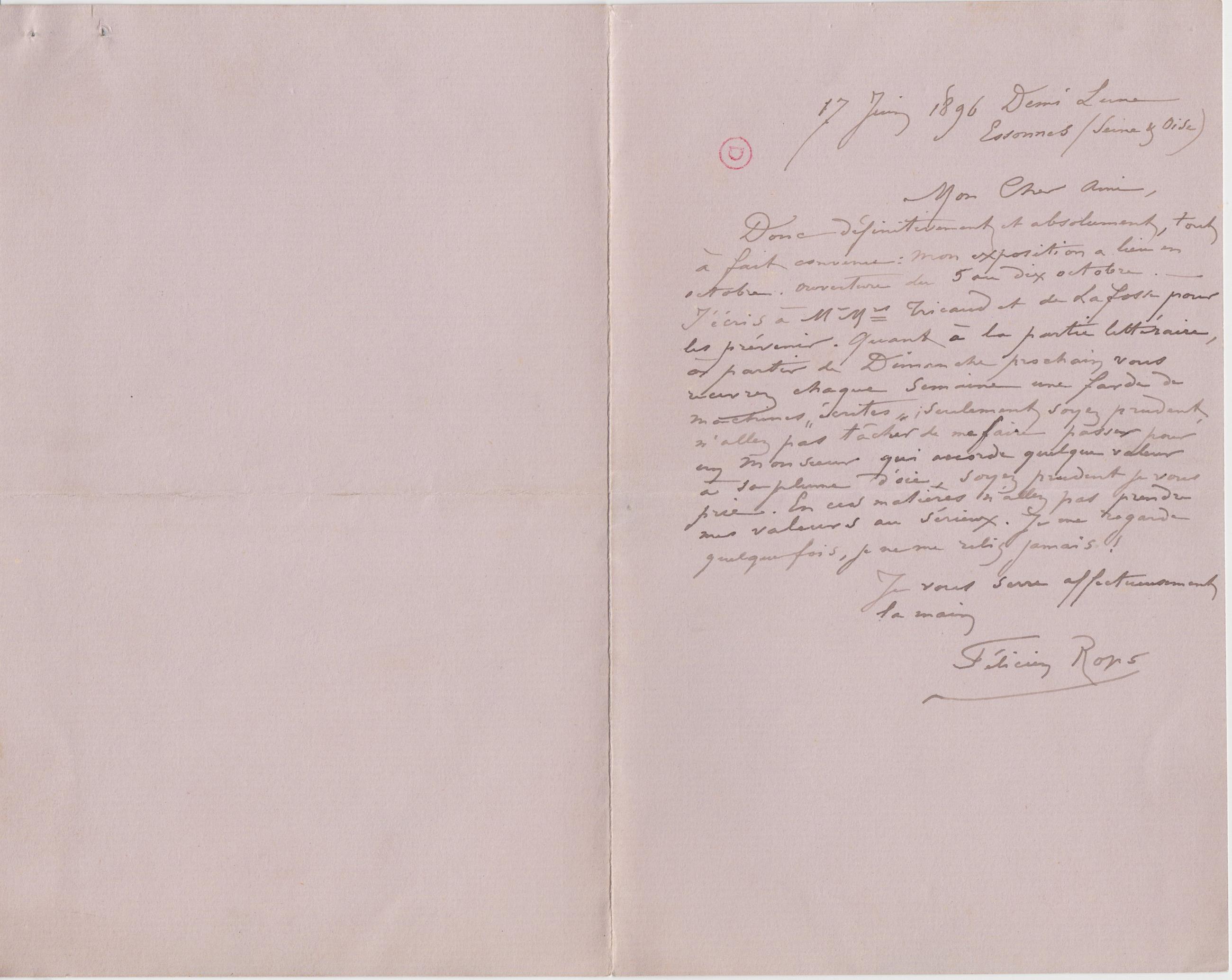 Donc définitivement et absolument, tout à fait convenu : mon exposition a lieu en octobre. Ouverture du 5 au dix octobre. – J’écris à Mr Mrs Tricaud et de Lafosse pour les prévenir. Quant à la partie littéraire, à partir de Dimanche prochain vous recevrez chaque semaine une farde de machines « écrites » ; seulement soyez prudent, n’allez pas tâcher de me faire passer pour un Monsieur qui accorde quelque valeur à sa plume d’oie, soyez prudent je vous prie. En ces matières n’allez pas prendre mes valeurs au sérieux. Je me regarde quelque fois, je ne me relis jamais !