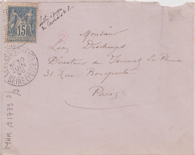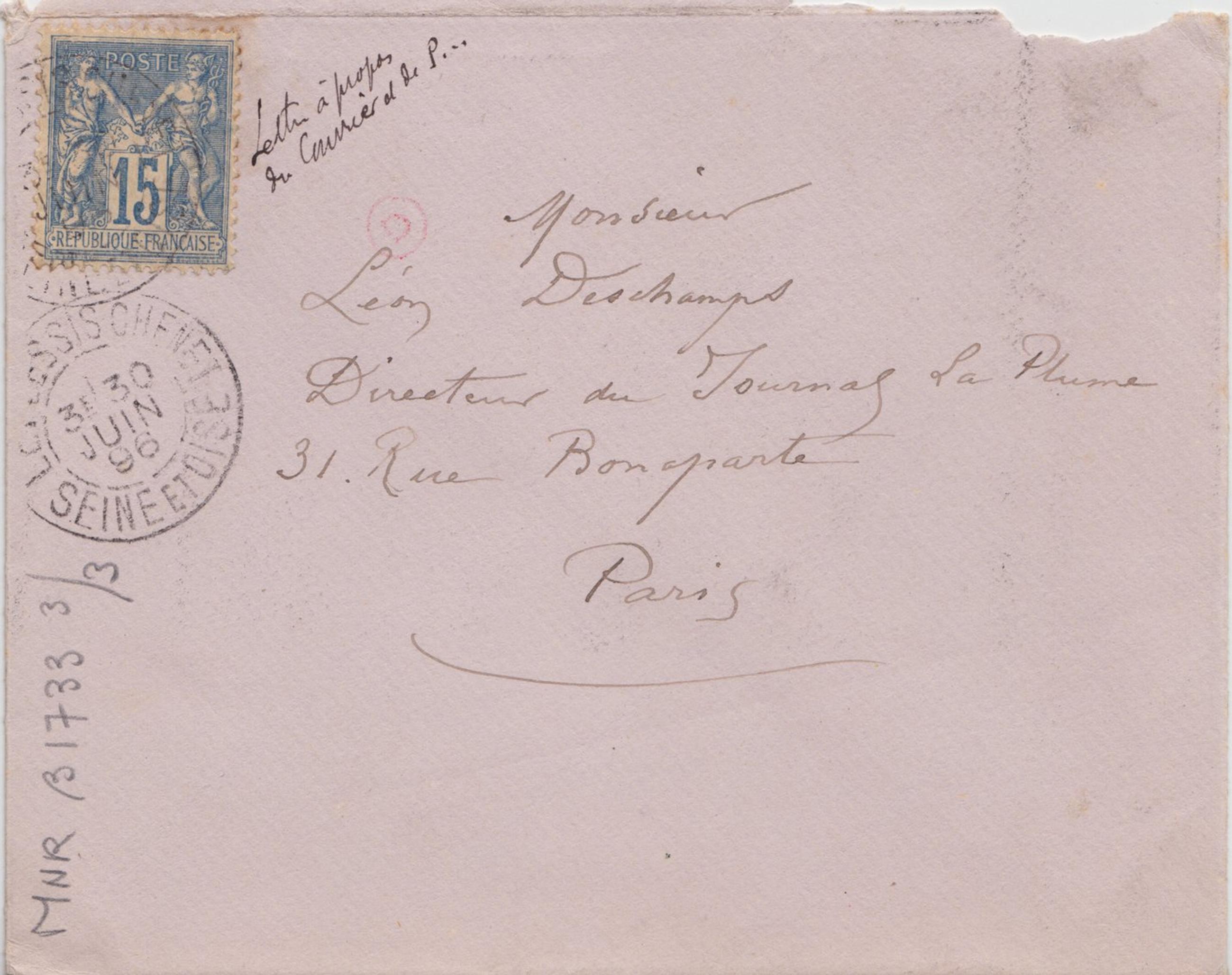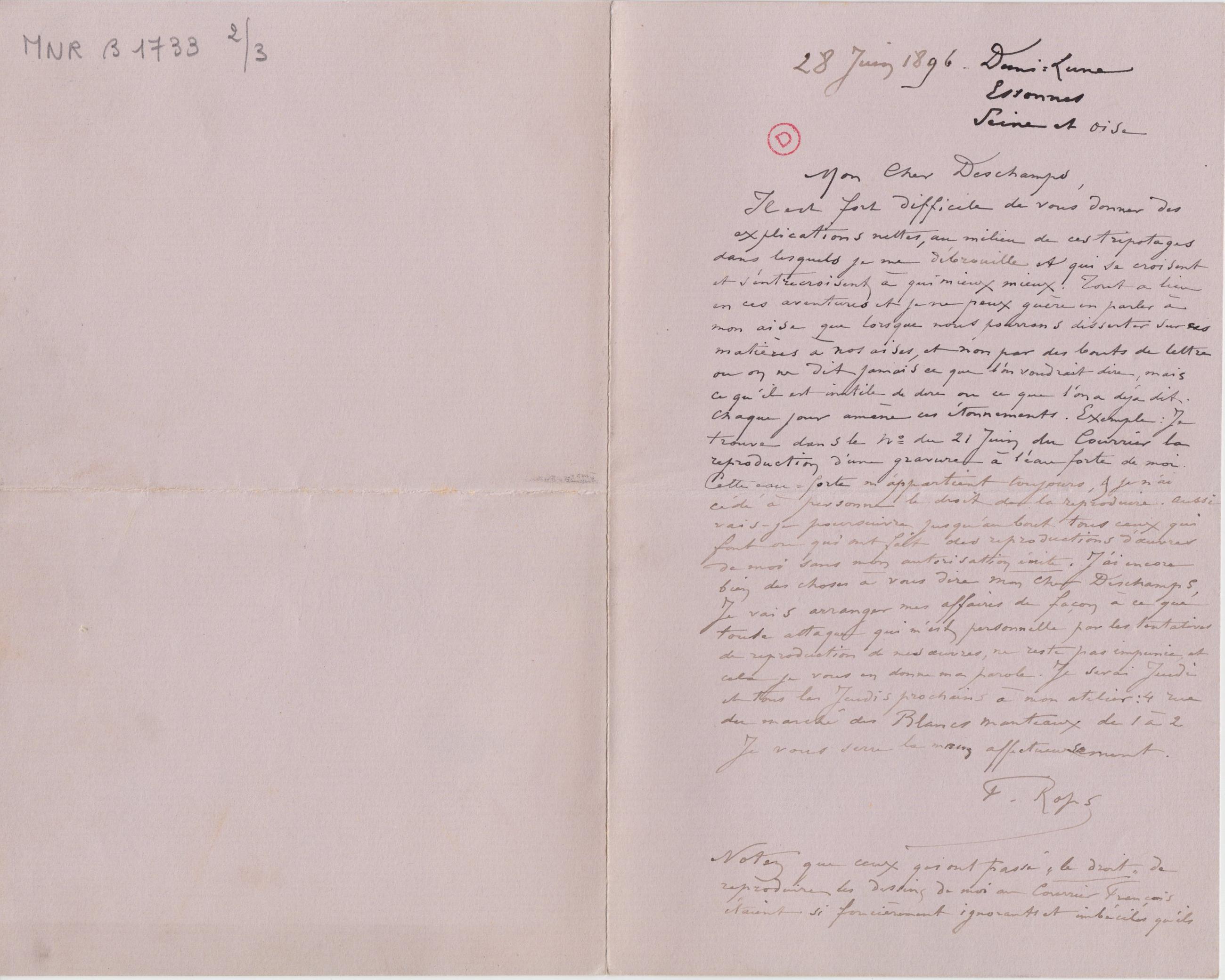 Cette eau-forte m’appartient toujours, & je n’ai cédé à personne le droit de la reproduire. Aussi vais-je poursuivre jusqu’au bout tous ceux qui font ou qui ont fait des reproductions d’oeuvres de moi sans mon autorisation écrite. J’ai encore bien des choses à vous dire mon Cher Deschamps, Je vais arranger mes affaires de façon à ce que toute attaque qui m’est personnelle par les tentatives de reproduction de mes oeuvres, ne reste pas impunie, et cela je vous en donne ma parole. Je serai Jeudi et tous les Jeudis prochains à mon atelier : 4 rue du marché des Blancs Manteaux de 1 à 2