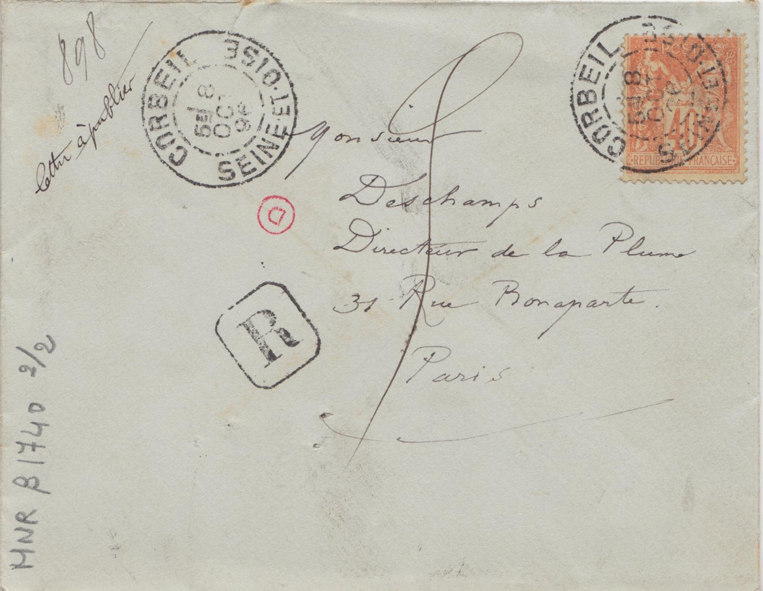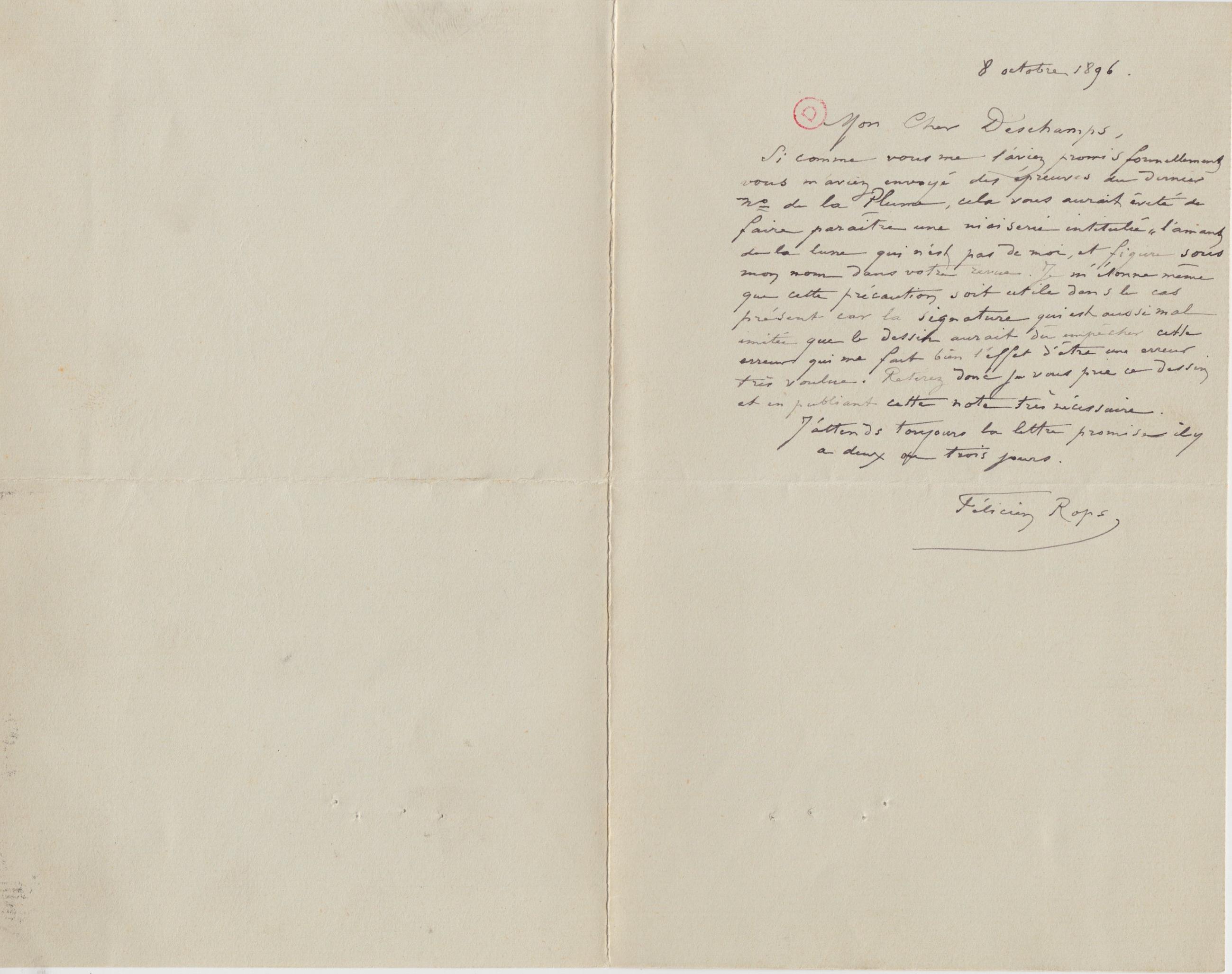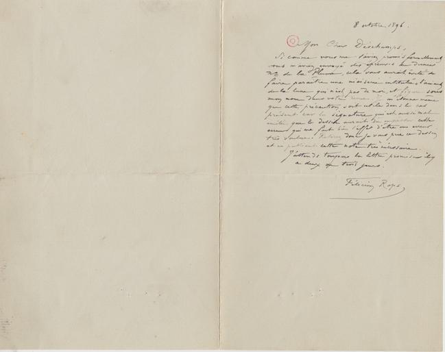 Si comme vous me l’aviez promis formellement vous m’aviez envoyé des épreuves du dernier n° de la Plume, cela vous aurait évité de faire paraître une niaiserie intitulée « l’amant de la lune qui n’est pas de moi, et figure sous mon nom dans votre revue. Je m’étonne même que cette précaution soit utile dans le cas présent car la signature qui est aussi mal imitée que le dessin aurait dû empêcher cette erreur qui me fait bien l’effet d’être une erreur très voulue. Retirez donc je vous prie ce dessin et en publiant cette note très nécessaire.