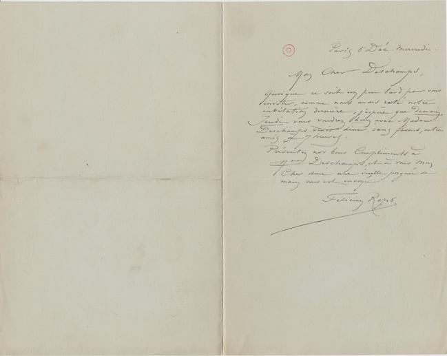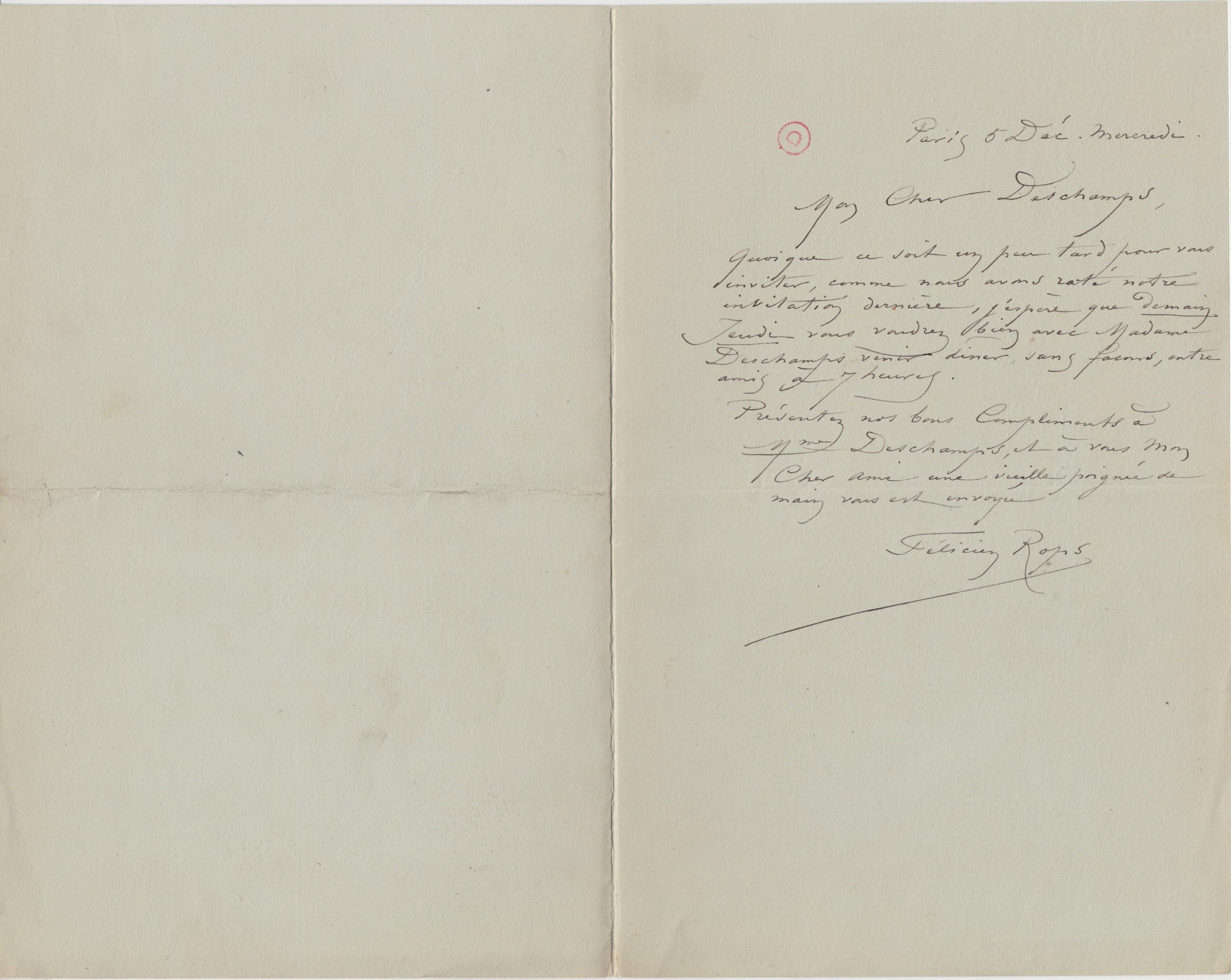 Quoique ce soit un peu tard pour vous inviter, comme nous avons raté notre invitation dernière, j’espère que demain Jeudi vous voudrez bien avec Madame Deschamps venir dîner, sans facons, entre amis à 7 heures.