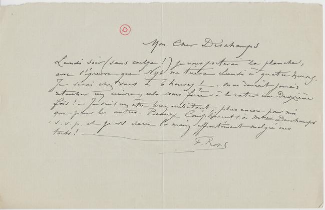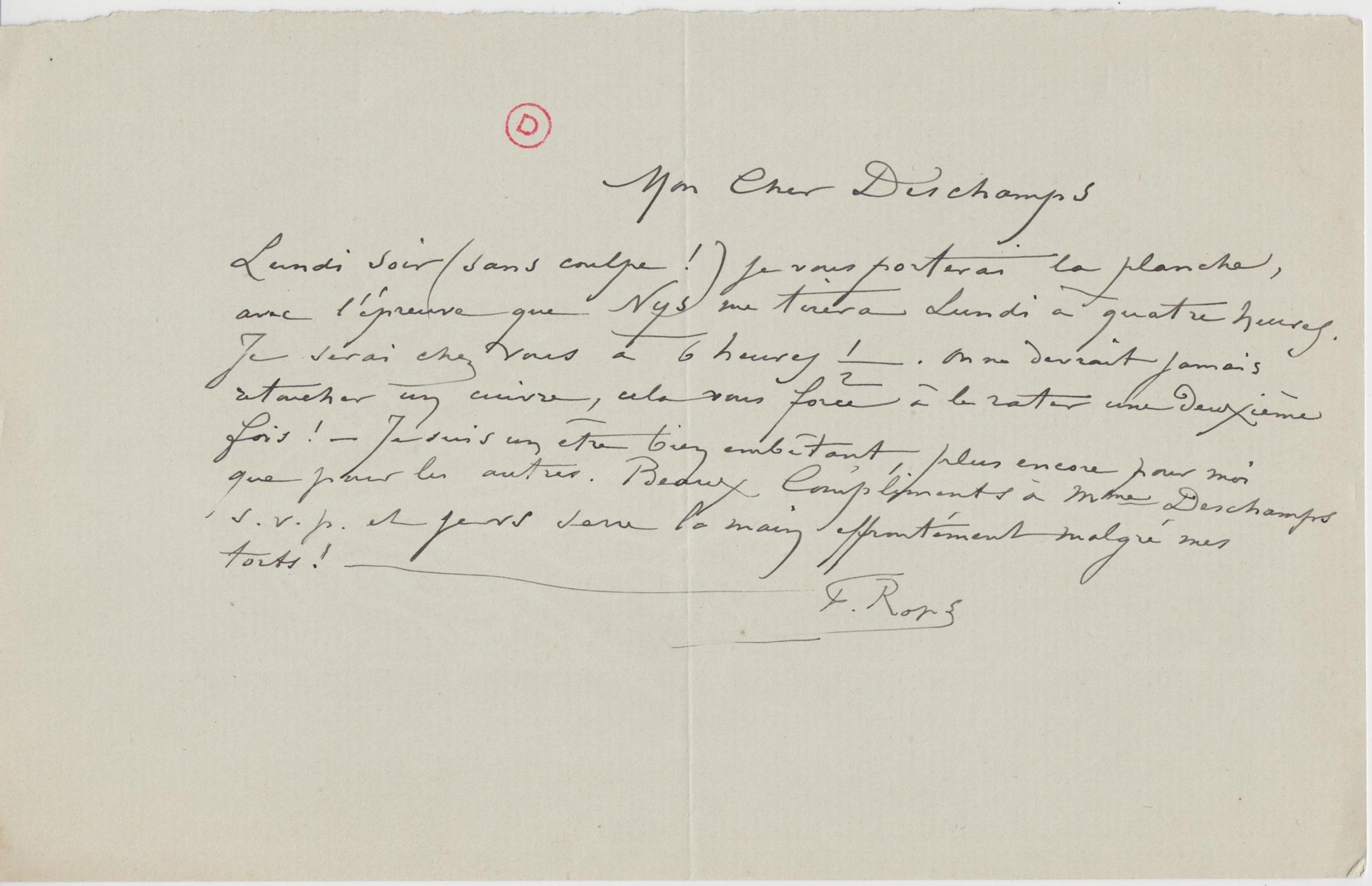 Lundi soir (sans coulpe !) je vous porterai la planche, avec l’épreuve que Nys me tirera Lundi à quatre heures. Je serai chez vous à 6 heures ½. On ne devrait jamais retoucher un cuivre, cela vous force à le rater une deuxième fois ! – Je suis un être bien embetant, plus encore pour moi que pour les autres.
