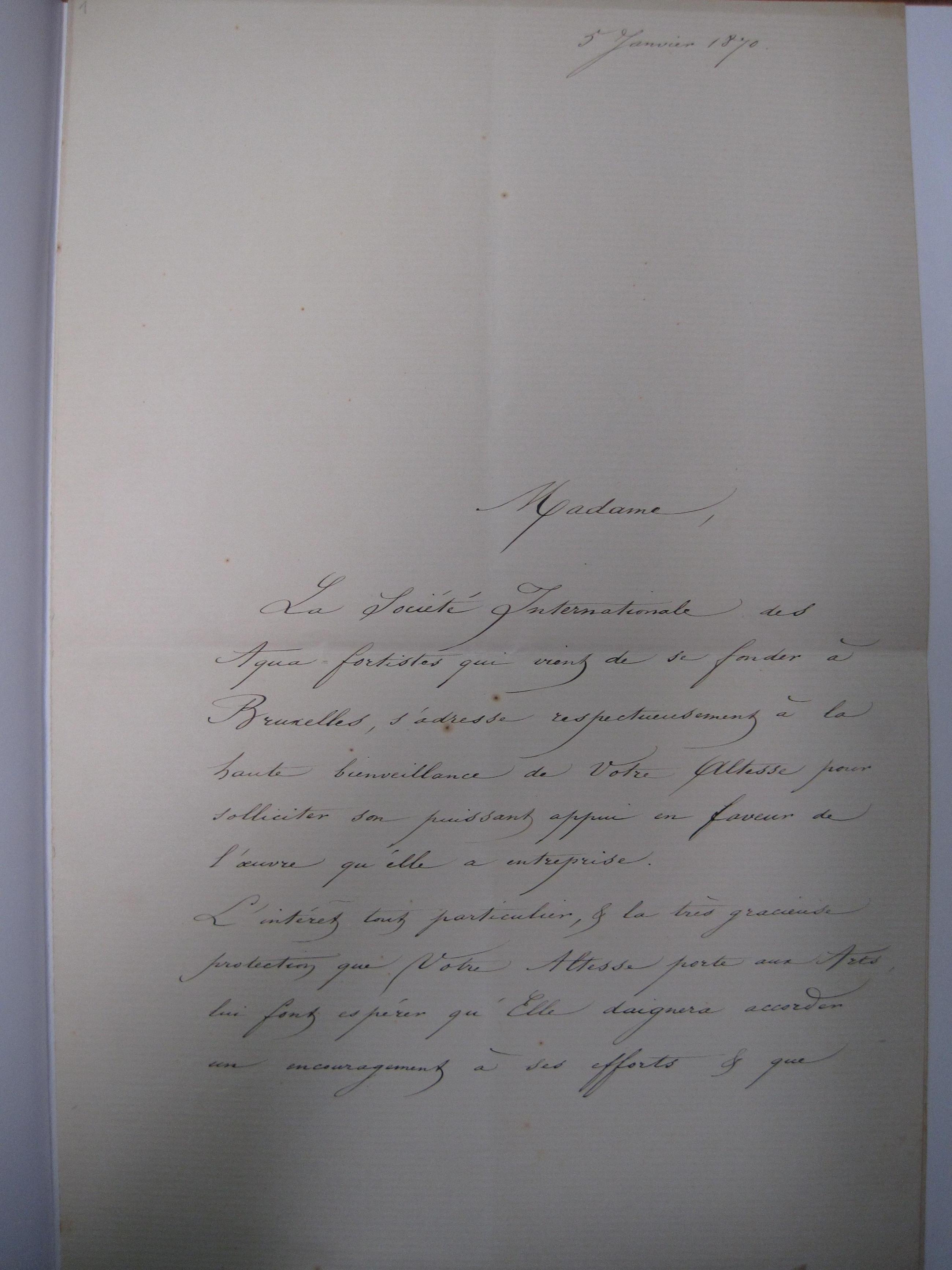 La Société Internationale des Aqua-fortistes qui vient de se fonder à Bruxelles, s’adresse respectueusement à la haute bienveillance de Votre Altesse pour solliciter son puissant appui en faveur de l’œuvre qu’elle a entreprise.