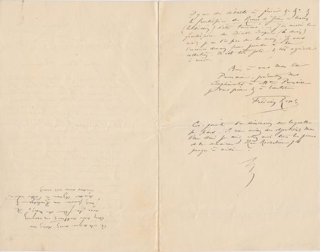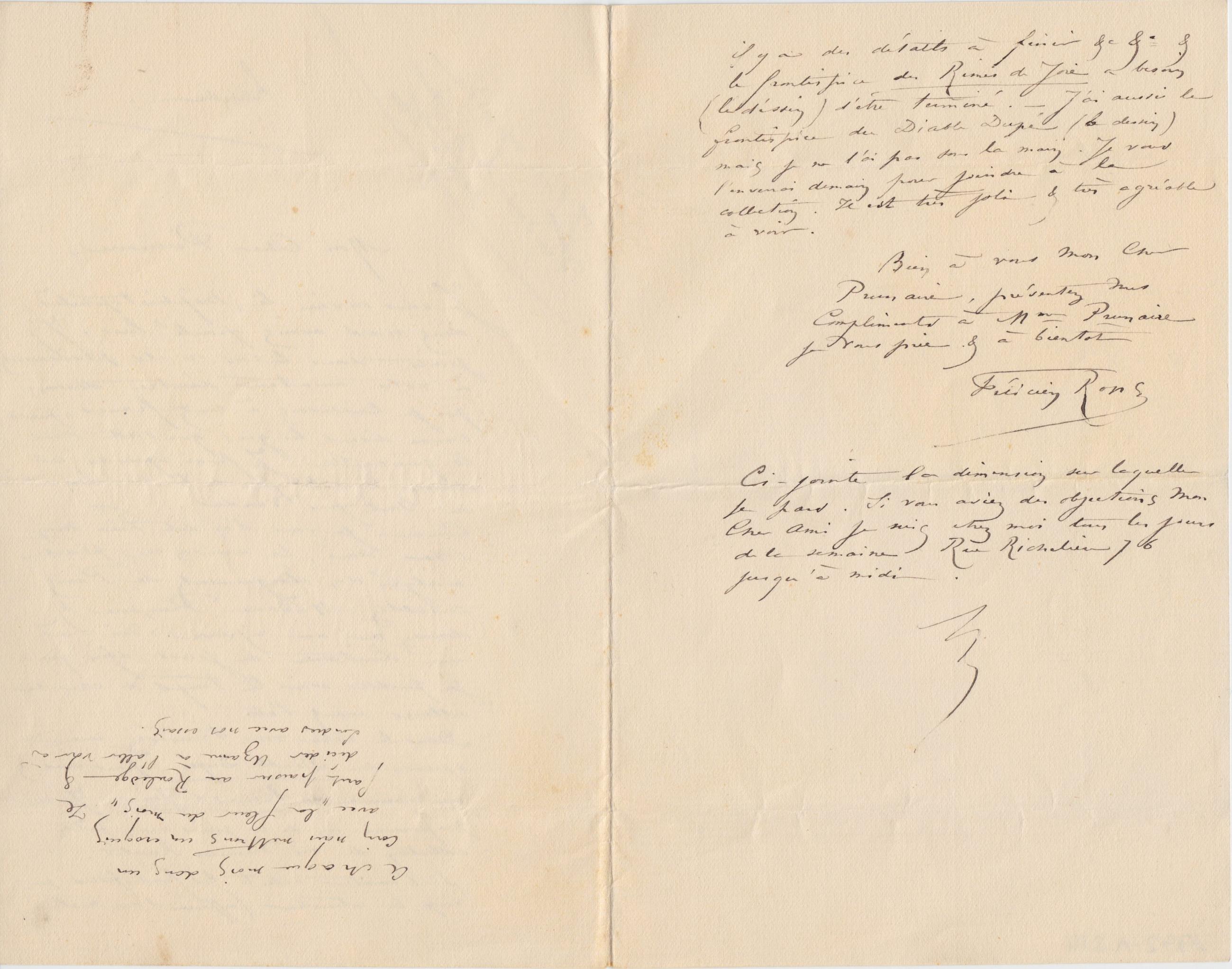il y a des détails à finir &c &c & le frontispice des Rimes de Joie a besoin (le dessin) d’être terminé. – J’ai aussi le frontispice du Diable Dupé (le dessin) mais je ne l’ai pas sous la main. Je vous l’enverrai demain pour joindre à la collection. Il est très joli & très agréable à voir.