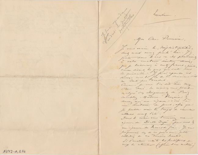 Comme je vous l’ai dit hier Mon Cher Ami, la maison me plaît malgré son éloignement de Paris, consultez Madame Prunaire & donnez moi une réponse d’ici à une huitaine de jours, afin que je puisse avoir le temps de chercher ailleurs avant l’été.