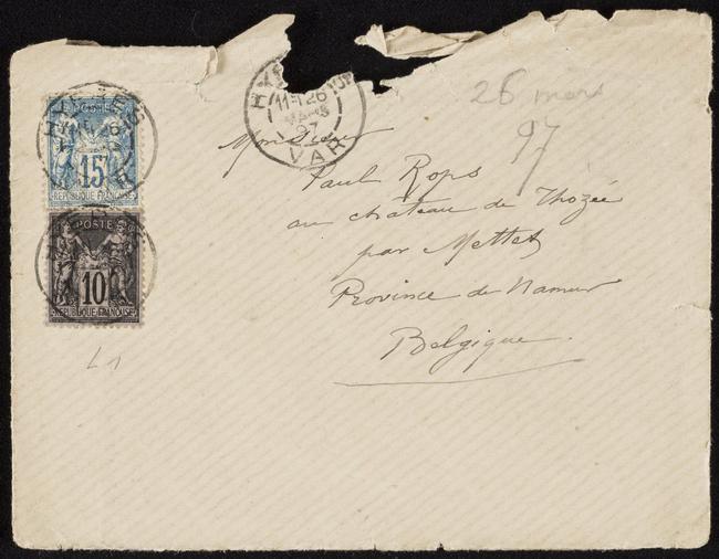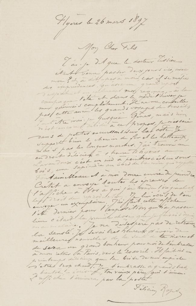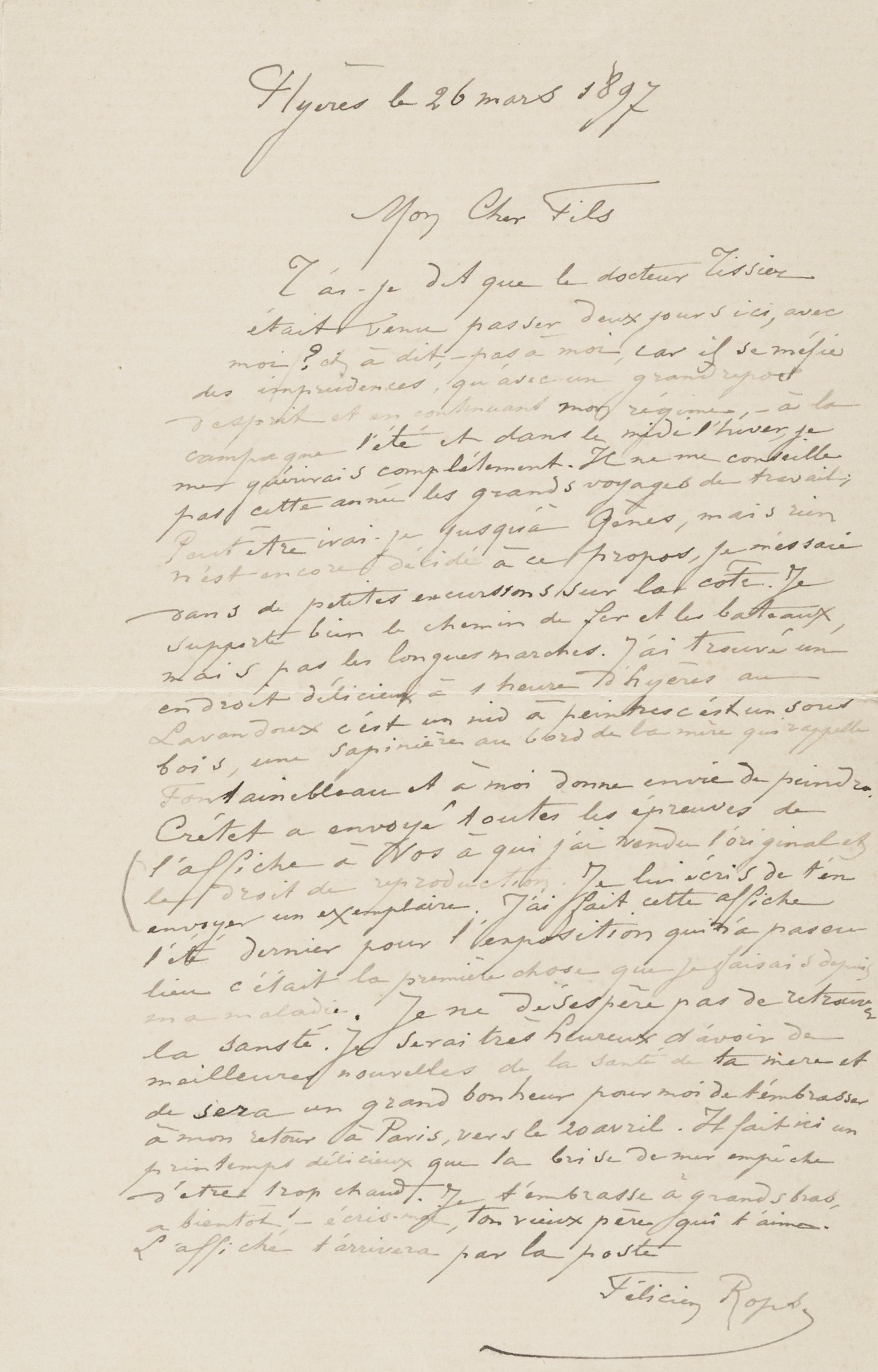 T’ai-je dit que le docteur Tissier était venu passer deux jours ici, avec moi ? et a dit, – pas à moi, car il se méfie des imprudences, qu’avec un grand repos d’esprit et en continuant mon régime, – à la campagne l’été et dans le midi l’hiver, je me guérirais complètement. Il ne me conseille pas cette année les grands voyages de travail ; Peut être irai-je jusqu’à Gênes, mais rien n’est encore décidé à ce propos, je m’essaie dans de petites excursions sur la côte. Je supporte bien le chemin de fer et les bateaux mais pas les longues marches. J’ai trouvé un endroit délicieux à 1 heure d’Hyères au Lavandoux c’est un nid à peintres c’est un sous bois, une sapinière au bord de la mère qui rappelle Fontainebleau et à moi donne envie de peindre. Crétet a envoyé toutes les épreuves de l’affiche à Vos à qui j’ai vendu l’original et le droit de reproduction. Je lui écris de t’en envoyer un exemplaire. J’ai fait cette affiche l’été dernier pour l’exposition qui n’a pas eu lieu c’était la première chose que je faisais depuis ma maladie. Je ne désespère pas de retrouver la santé. Je serai très heureux d’avoir de meilleures nouvelles de la santé de ta mère et ce sera un grand bonheur pour moi de t’embrasser à mon retour à Paris, vers le 20 avril. Il fait ici un printemps délicieux que la brise de mer empêche d’être trop chaud. Je t’embrasse à grands bras, a bientôt ! – écris-moi, ton vieux père qui t’aime.
