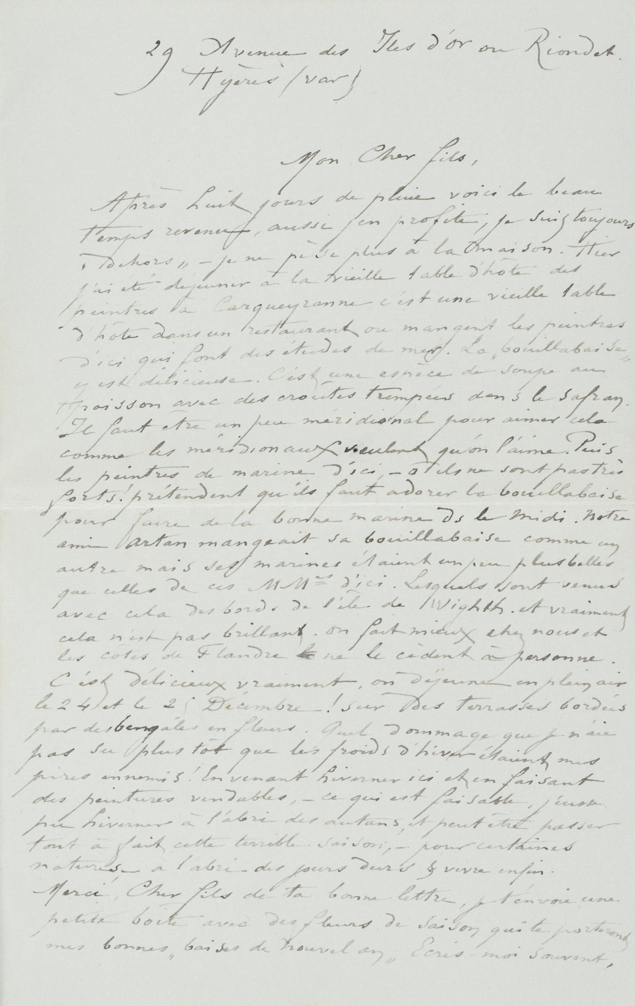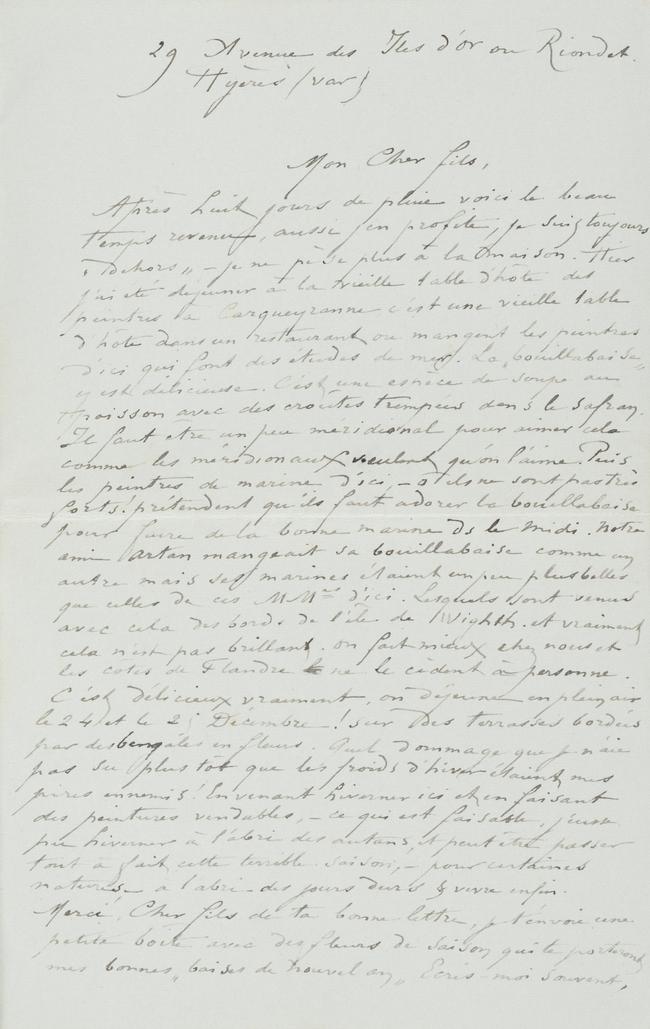 Après huit jours de pluie voici le beau temps revenu, aussi j’en profite, je suis toujours « dehors » – je ne pèse plus à la maison. Hier j’ai été déjeuner à la vieille table d’hôte des peintres à Carqueyranne c’est une vieille table d’hôte dans un restaurant où mangent les peintres d’ici qui font des études de mer. La « bouillabaise » y est délicieuse. C’est une espèce de soupe au poisson avec des croûtes trempées dans le safran. Il faut être un peu méridional pour aimer cela comme les méridionaux veulent qu’on l’aime. Puis les peintres de marine d’ici, – ô ils ne sont pas très forts ! prétendent qu’il faut adorer la bouillabaise pour faire de la bonne marine d[an]s le midi. Notre ami Artan mangeait sa bouillabaise comme un autre mais ses marines étaient un peu plus belles que celles de ces MMrs d’ici. Lesquels sont venus avec cela des bords de l’île de Wighth. et vraiment cela n’est pas brillant. On fait mieux chez nous et les côtes de Flandre le ne le cèdent à personne.