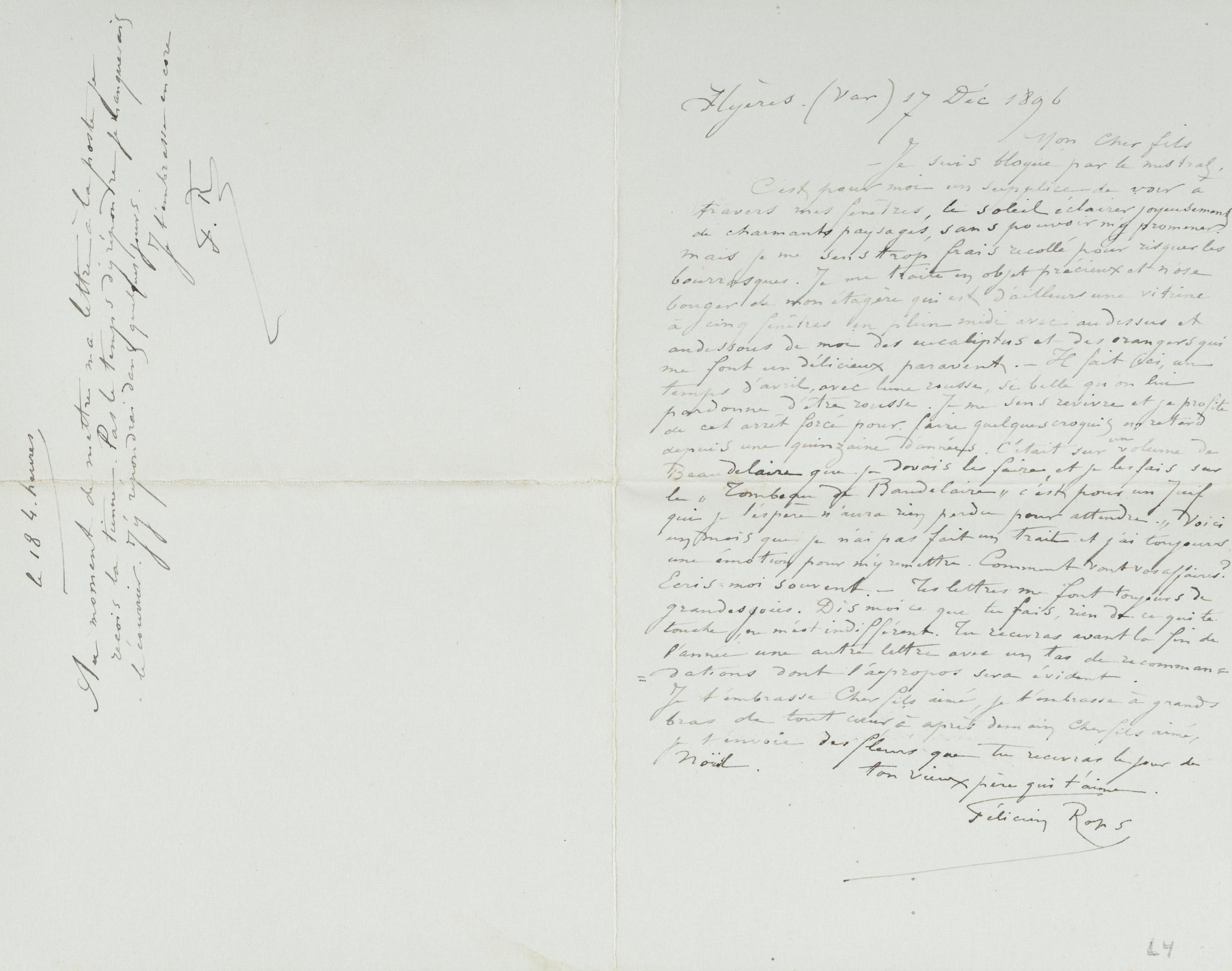 C’est pour moi un supplice de voir à travers mes fenêtres, le soleil éclairer joyeusement de charmants paysages, sans pouvoir m’y promener mais je me sens trop frais recollé pour risquer les bourrasques. Je me traite en objet précieux et n’ose bouger de mon étagère qui est d’ailleurs une vitrine à cinq fenêtres en plein midi avec au dessus et au dessous de moi des eucaliptus et des orangers qui me font un délicieux paravent. – Il fait ici, un temps d’avril, avec lune rousse, si belle qu’on lui pardonne d’être rousse. Je me sens revivre et je profite de cet arrêt forcé pour faire quelques croquis en retard depuis une quinzaine d’années. C’était sur / un / volume de Baudelaire que je devais les faire, et je les fais sur le « Tombeau de Baudelaire » c’est pour un Juif qui je l’espère n’aura rien perdu pour attendre. » Voici un mois que je n’ai pas fait un trait et j’ai toujours une émotion pour m’y remettre. Comment vont vos affaires ? Écris-moi souvent. – Tes lettres me font toujours de grandes joies. Dis moi ce que tu fais, rien de ce qui te touche ne m’est indifférent. Tu recevras avant la fin de l’année une autre lettre avec un tas de recommandations dont l’a-propos sera évident.