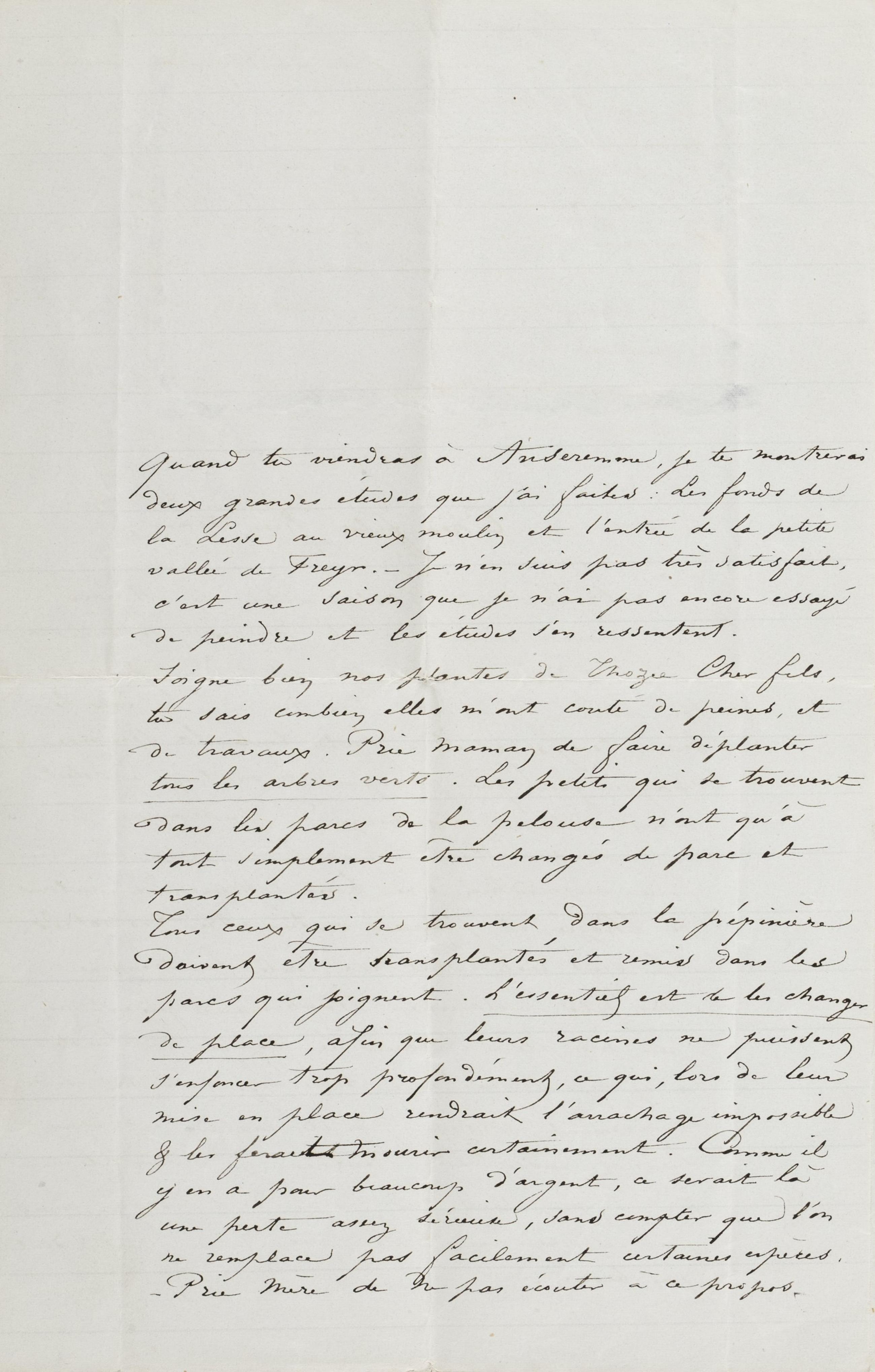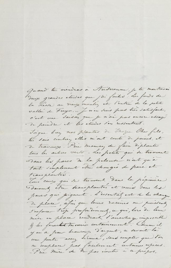 Soigne bien nos plantes de ThozéeCher fils, tu sais combien elles m’ont couté de peines, et de travaux. Prie Maman de faire déplanter tous les arbres verts. Les petits qui se trouvent dans les parcs de la pelouse n’ont qu’à tout simplement être changés de parc et transplantés.