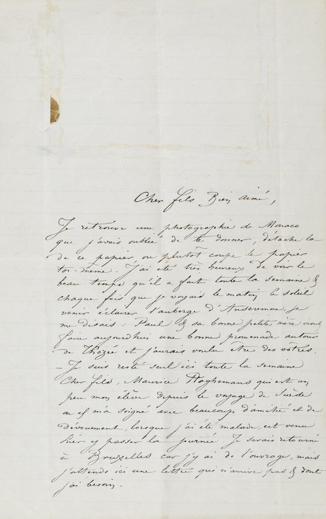 – Je suis resté seul ici toute la semaine Cher fils, Maurice Haghemans qui est un peu mon élève depuis le voyage de Suède où il m’a soigné avec beaucoup d’amitié et de dévouement, lorsque j’ai été malade, est venu hier y passer la journée. Je serais retourné à Bruxelles car j’y ai de l’ouvrage, mais j’attends ici une lettre qui n’arrive pas & dont j’ai besoin.