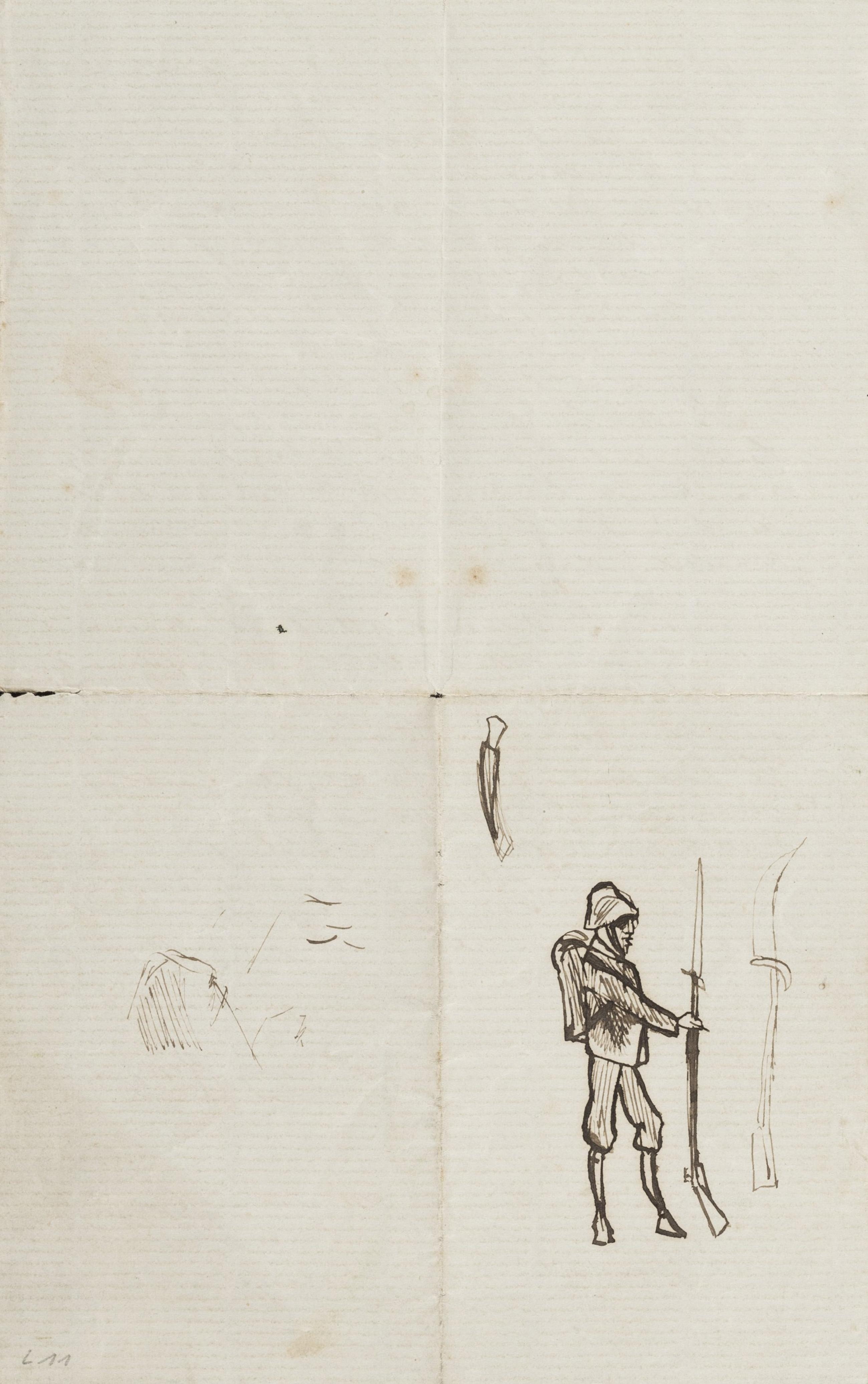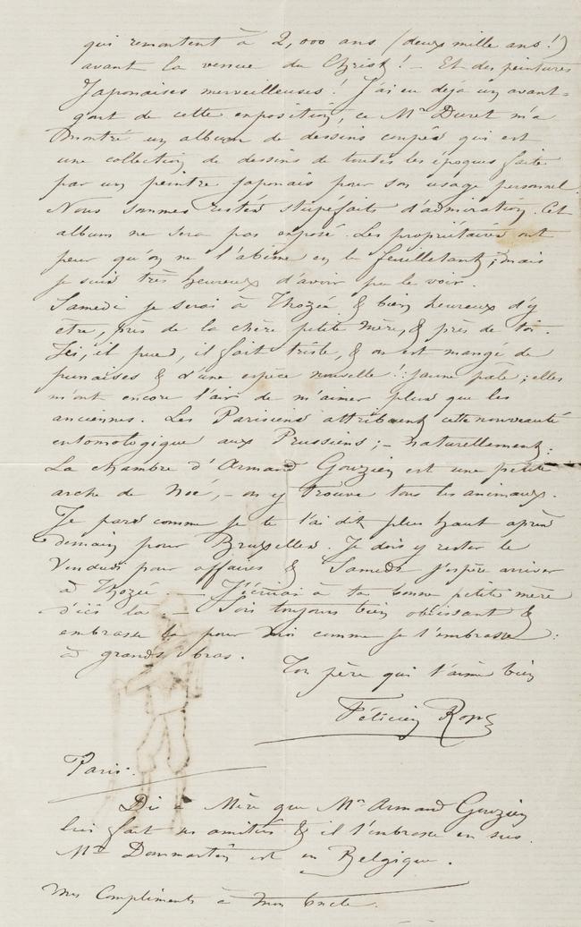 Samedi je serai à Thozée & bien heureux d’y être, près de la chère petite mère, & près de toi. Ici, il pue, il fait triste, & on est mangé de punaises & d’une espèce nouvelle ! : jaune pâle ; elles m’ont encore l’air de m’aimer plus que les anciennes. Les Parisiens attribuent cette nouveauté entomologique aux Prussiens ; – naturellement. La chambre d’Armand Gouzien est une petite arche de Noé, – on y trouve tous les animaux. Je pars comme je te l’ai dit plus haut après demain pour Bruxelles. Je dois y rester le vendredi pour affaires & Samedi j’espère arriver à Thozée. – J’écrirai à ta bonne petite mère d’ici là. – Sois toujours bien obéissant & embrasse la pour moi comme je t’embrasse : à grands bras.