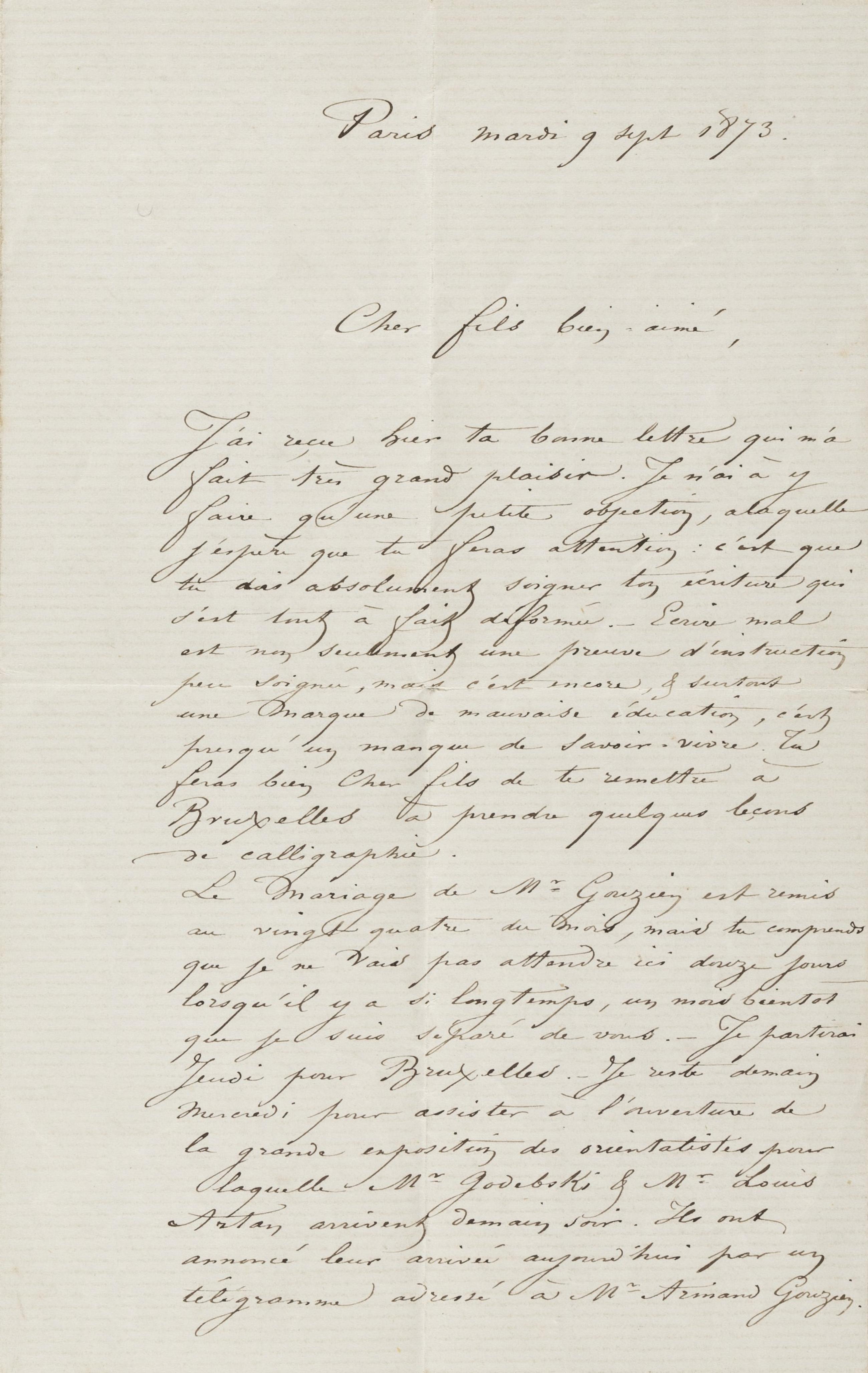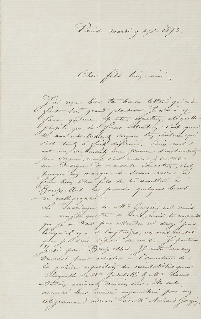 J’ai reçu hier ta bonne lettre qui m’a fait très grand plaisir. Je n’ai à y faire qu’une petite objection, a laquelle j’espère que tu feras attention : c’est que tu dois absolument soigner ton écriture qui s’est tout à fait déformée. – Écrire mal est non seulement une preuve d’instruction peu soignée, mais c’est encore, & surtout une marque de mauvaise éducation, c’est presqu’un manque de savoir-vivre. Tu feras bien Cher fils de te remettre à Bruxelles à prendre quelques leçons de calligraphie.