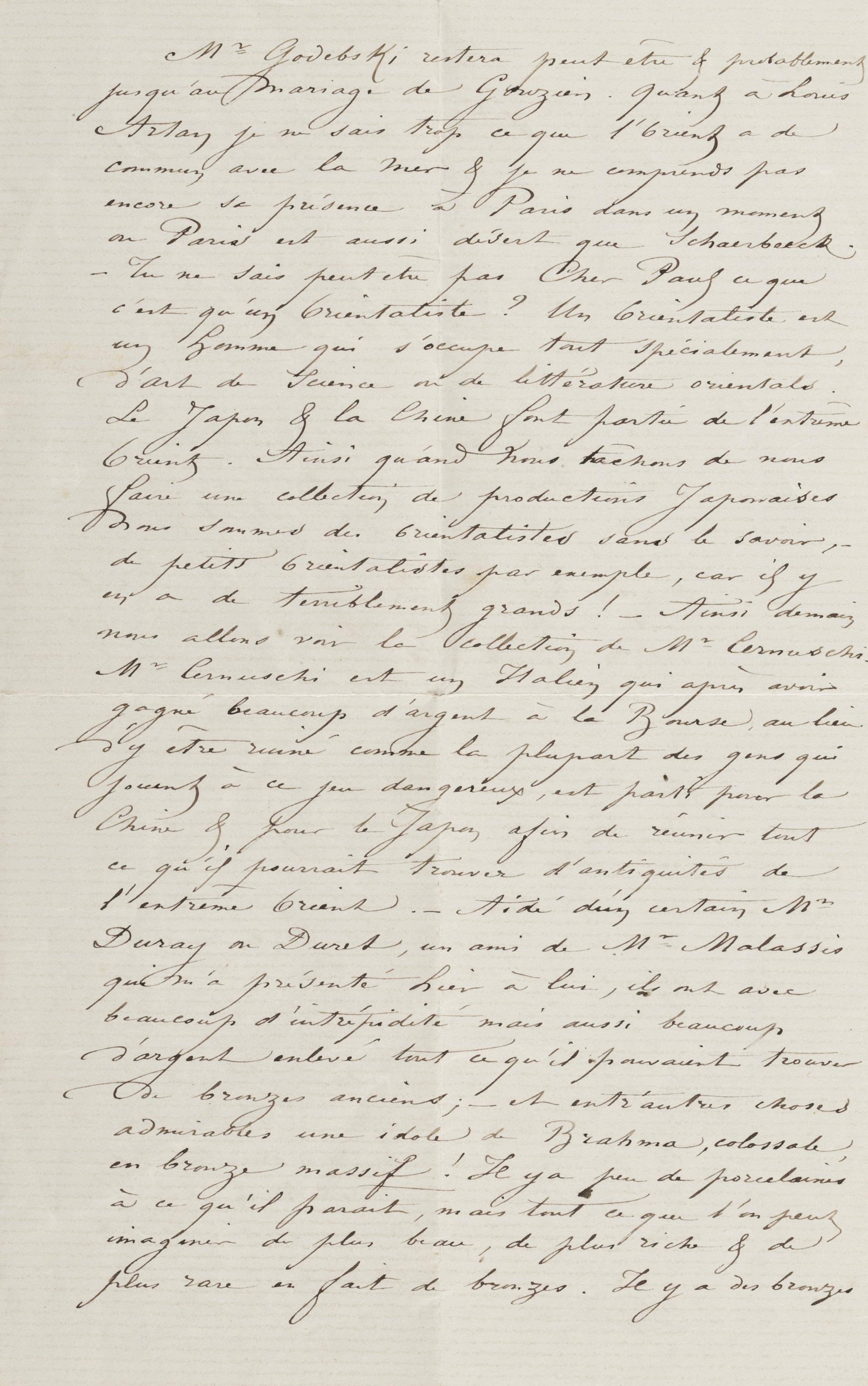 Mr Godebski restera peut être & probablement jusqu’au mariage de Gouzien. Quant à Louis Artan je ne sais trop ce que l’Orient a de commun avec la mer & je ne comprends pas encore sa présence à Paris dans un moment où Paris est aussi désert que Schaerbeeck. – Tu ne sais peut être pas Cher Paul ce que c’est qu’un Orientaliste ? Un Orientaliste est un homme qui s’occupe tout spécialement, d’Art de Science ou de littérature orientale. Le Japon & la Chine font partie de l’extrême Orient. Ainsi qu’and nous tâchons de nous faire une collection de productions Japonaises nous sommes des Orientalistes sans le savoir, – de petits Orientalistes par exemple, car il y en a de terriblement grands ! – Ainsi demain nous allons voir la collection de Mr Cernuschi. Mr Cernuschi est un Italien qui après avoir gagné beaucoup d’argent à la Bourse, au lieu d’y être ruiné comme la plupart des gens qui jouent à ce jeu dangereux, est parti pour la Chine & pour le Japon afin de réunir tout ce qu’il pourrait trouver d’antiquités de l’extrême Orient. – Aidé d’un certain Mr Duray ou Duret, un ami de Mr Malassis qui m’a présenté hier à lui, ils ont avec beaucoup d’intrépidité mais aussi beaucoup d’argent enlevé tout ce qu’ils pouvaient trouver de bronzes anciens ; – et entr’autres choses admirables une idole de Brahma, colossale, en bronze massif ! Il y a peu de porcelaines à ce qu’il paraît, mais tout ce que l’on peut imaginer de plus beau, de plus riche & de plus rare en fait de bronzes. Il y a des bronzes