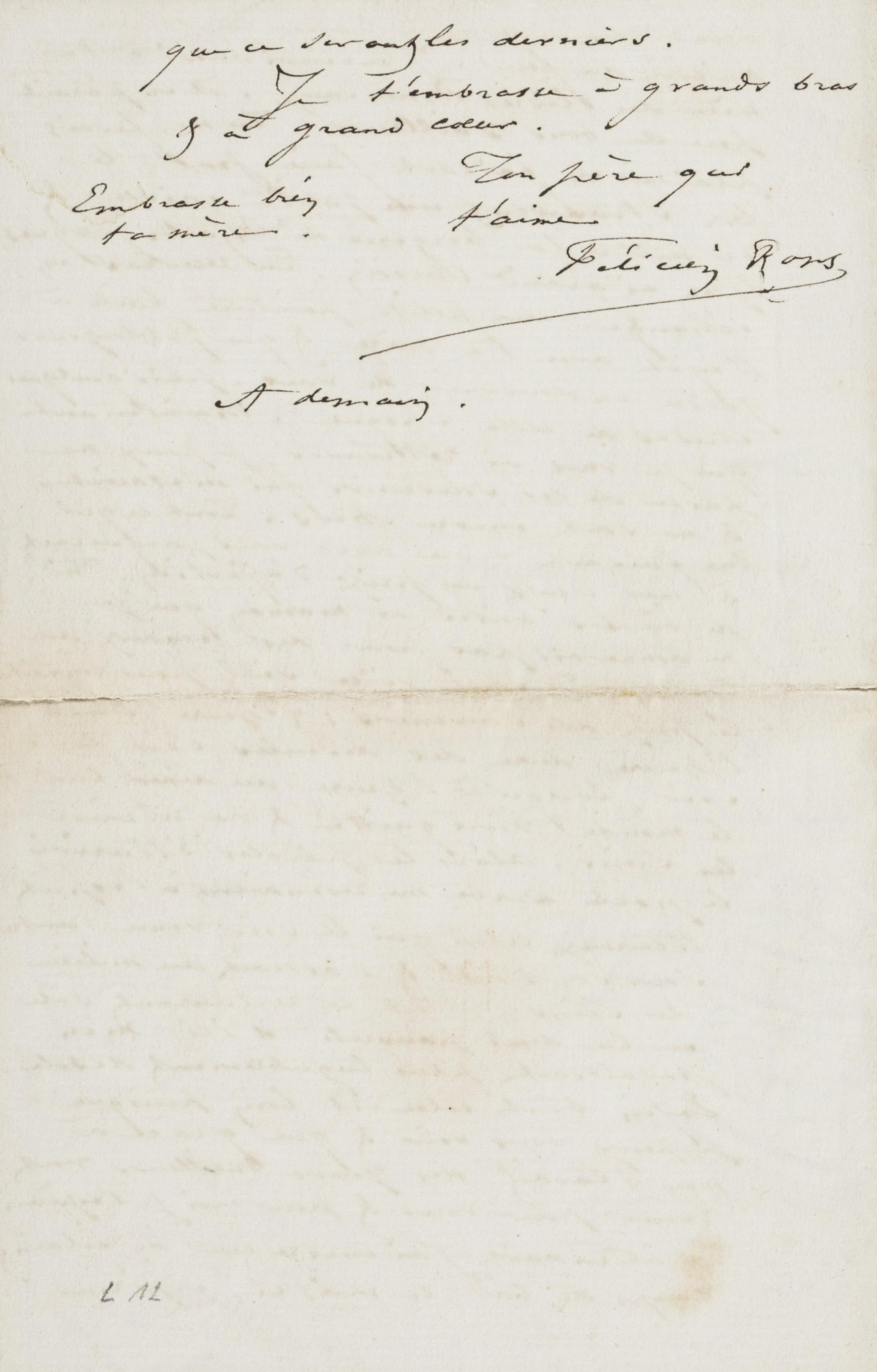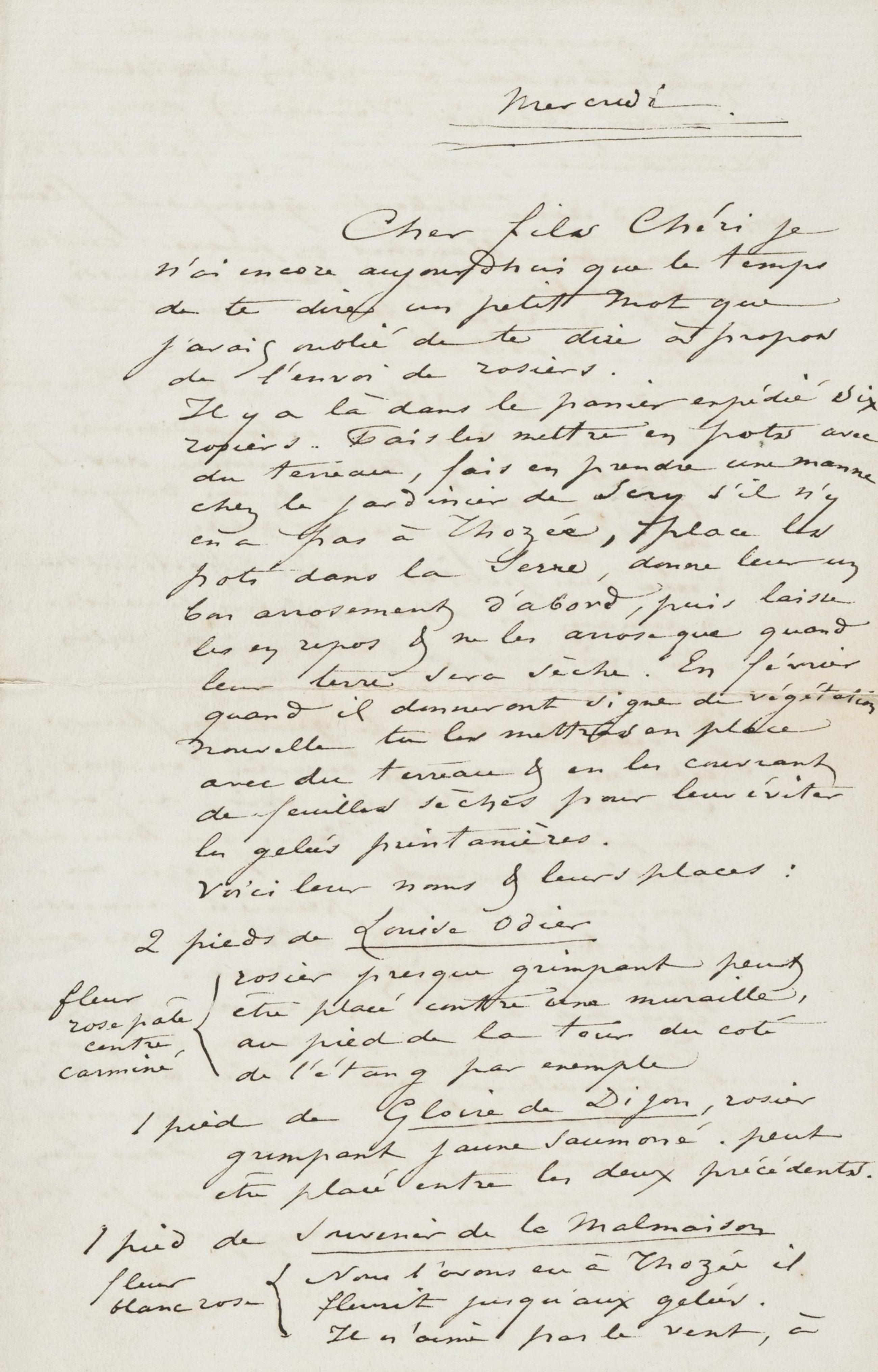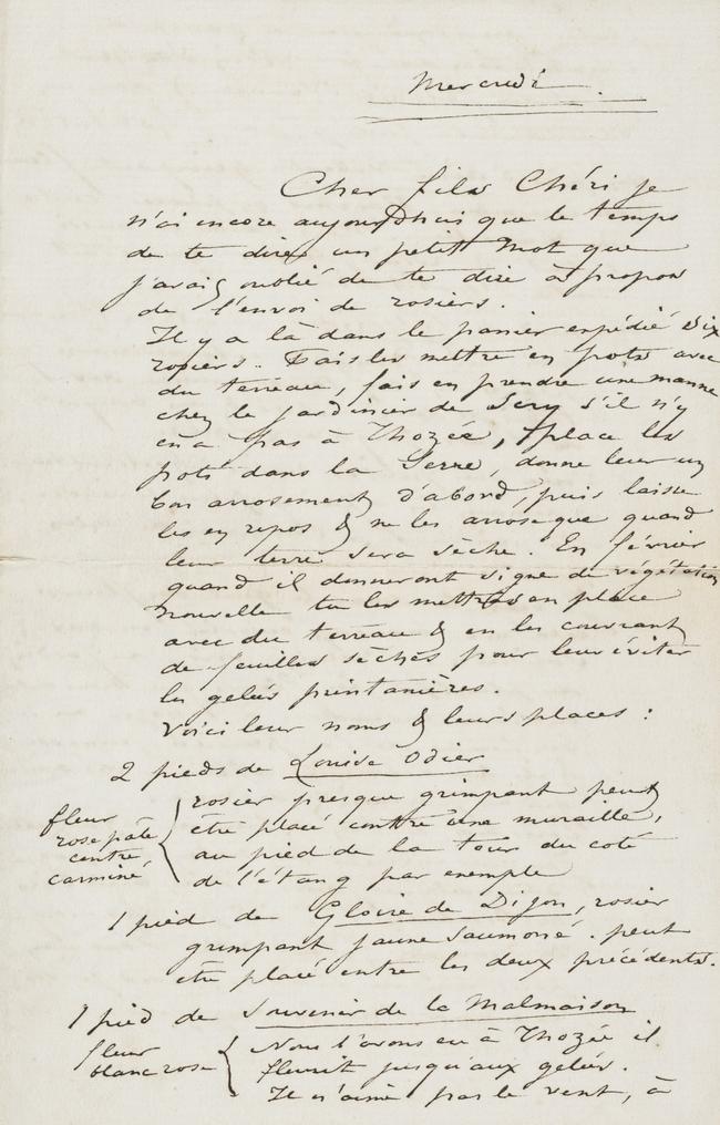 Il y a là dans le panier expédié six rosiers. Fais les mettre en pots avec du terreau, fais en prendre une manne chez le jardinier de Scry s’il n’y en a pas à Thozée, place les pots dans la Serre, donne leur un bon arrosement d’abord, puis laisse les en repos & ne les arrose que quand leur terre sera sèche. En février il donneront signe de végétation nouvelle tu les mettras en place avec du terreau & en les couvrant de feuilles sèches pour leur éviter les gelées printannières.