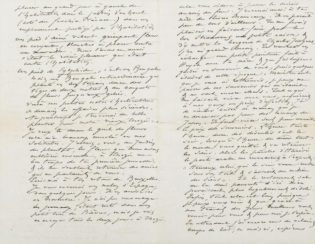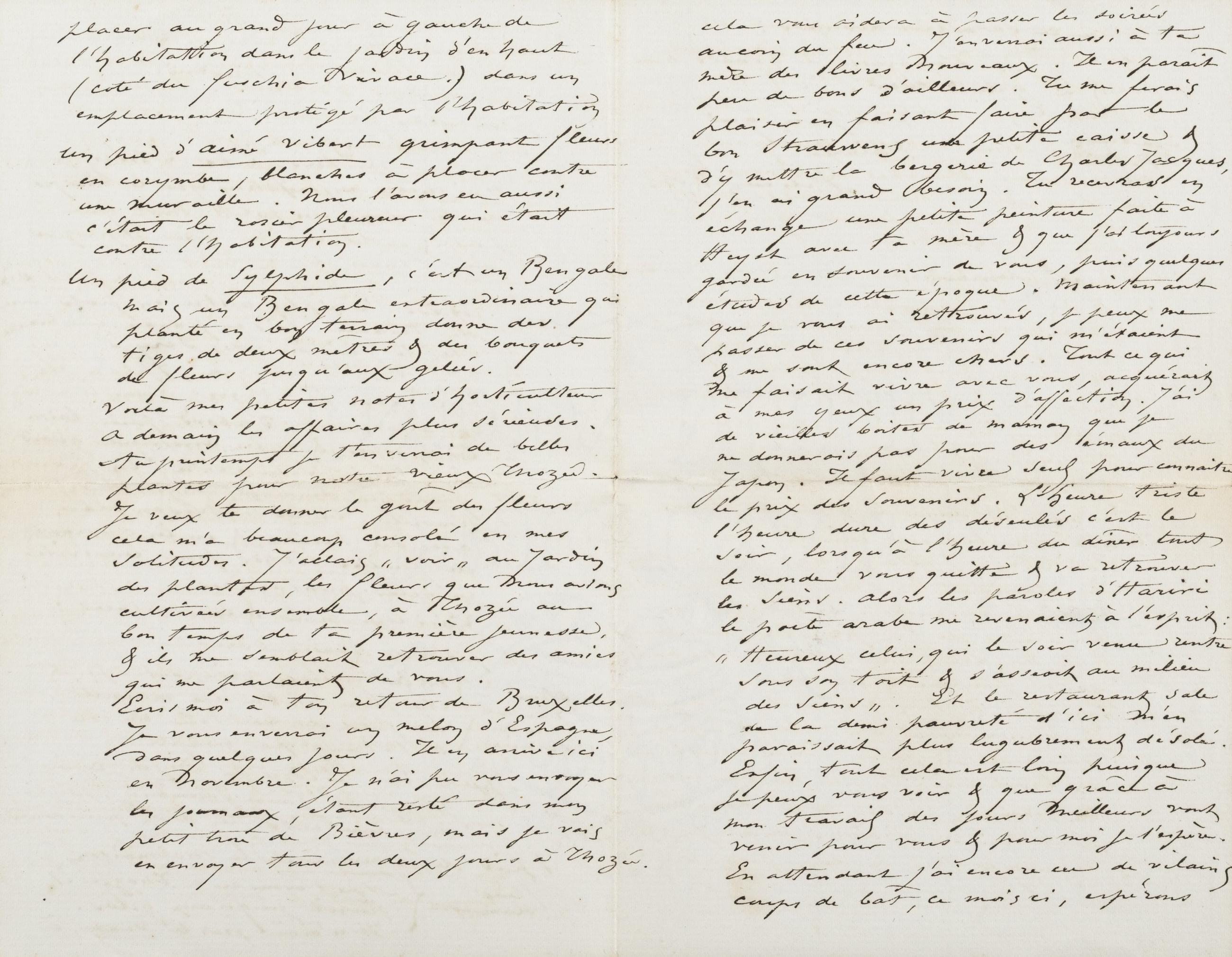 Voilà mes petites notes d’horticulteur À demain les affaires plus sérieuses. Au printemps je t’enverrai de belles plantes pour notre vieux Thozée. Je veux te donner le goût des fleurs cela m’a beaucoup consolé en mes solitudes. J’allais « voir » au Jardin des Plantes, les fleurs que nous avions cultivées ensemble, à Thozée au bon temps de ta première jeunesse, & il me semblait retrouver des amies qui me parlaient de vous.