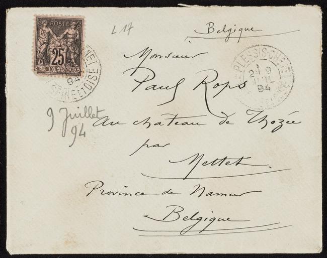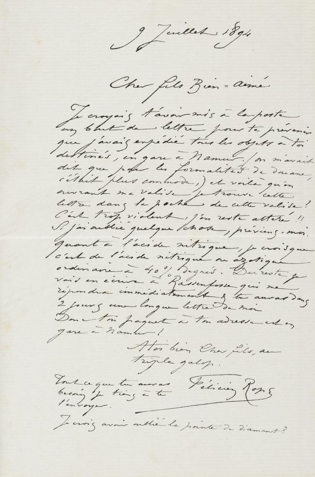 Je croyais t’avoir mis à la poste un bout de lettre pour te prévenir que j’avais expédié tous les objets à toi destinés, en gare à Namur. (on m’avait dit que pour les formalités de douane, c’était plus commode,) et voilà qu’en ouvrant ma valise je trouve cette lettre dans la poche de cette valise ! C’est trop violent, j’en reste atteré !! Si j’ai oublié quelque chose, préviens-moi. Quant à l’acide nitrique, je crois que c’est de l’acide nitrique ou azotique ordinaire à 40% degrés. Du reste je vais en écrire à Rassenfosse qui me répondra immédiatement & tu auras dans 2 jours une longue lettre de moi