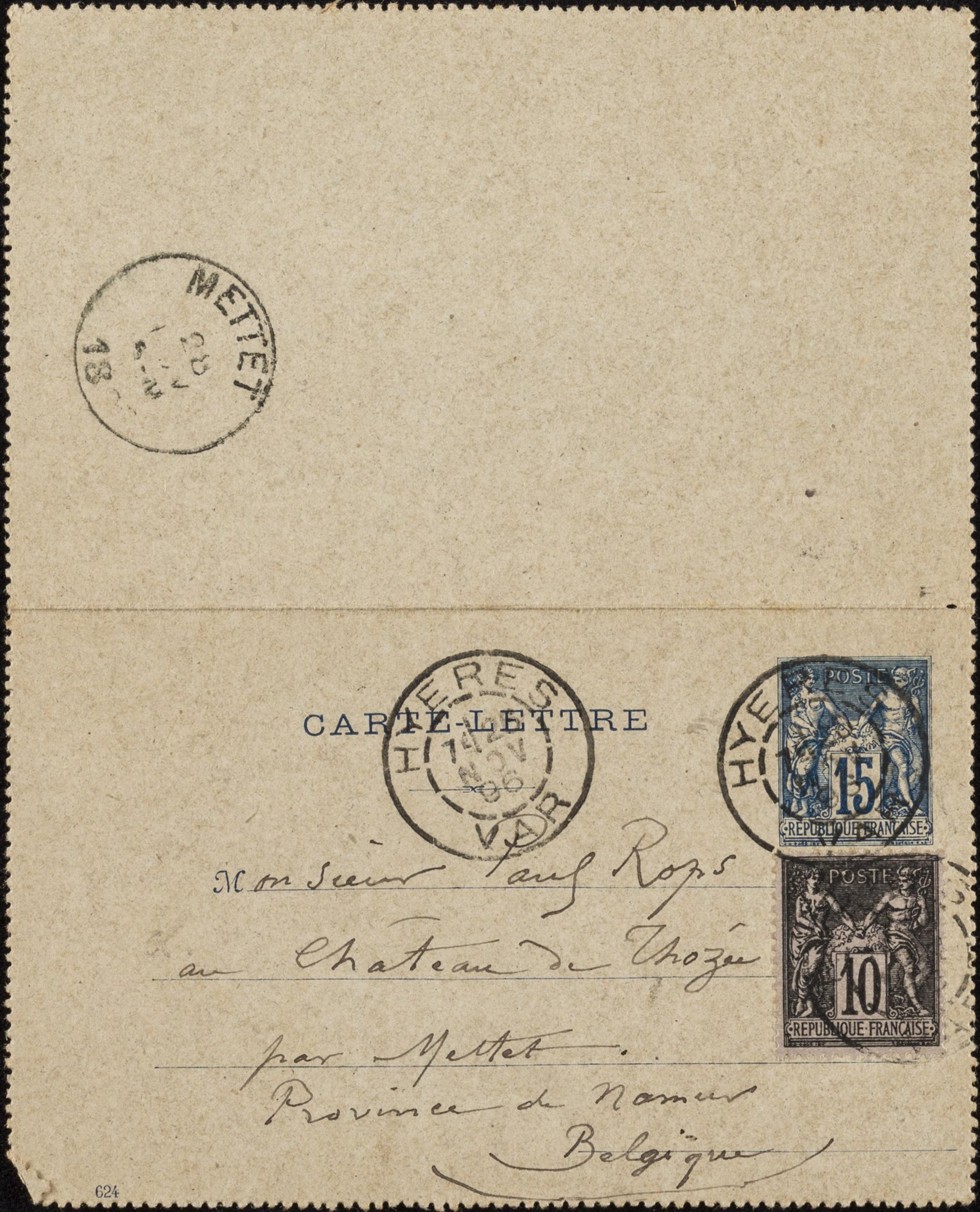 Monsieur Paul Ropsau Château de Thozéepar Mettet.Province de NamurBelgique Page 1 Verso : 2