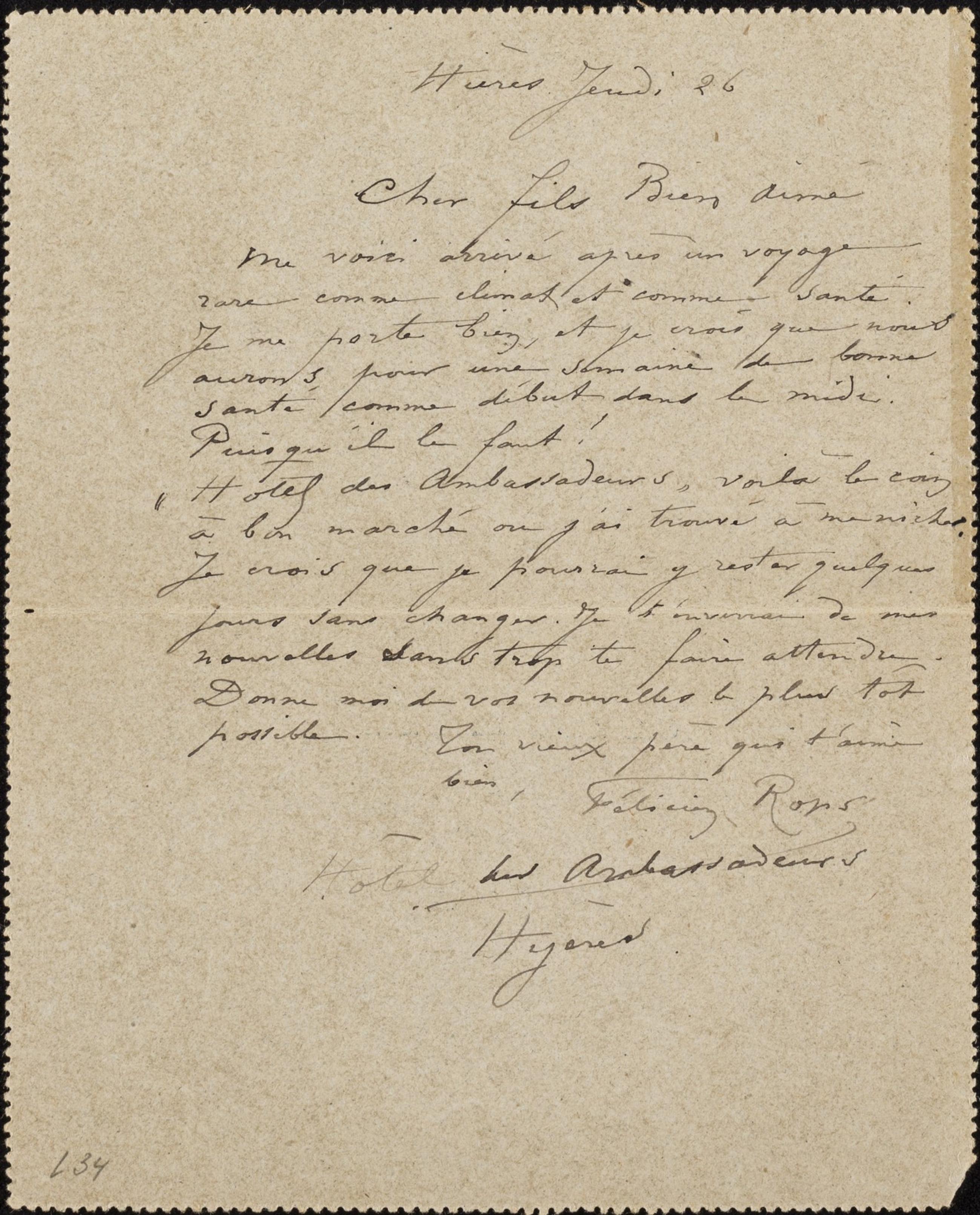 « Hôtel des Ambassadeurs » voilà le coin à bon marché où j’ai trouvé à me nicher. Je crois que je pourrai y rester quelques jours sans changer. Je t’enverrai de mes nouvelles sans trop te faire attendre.