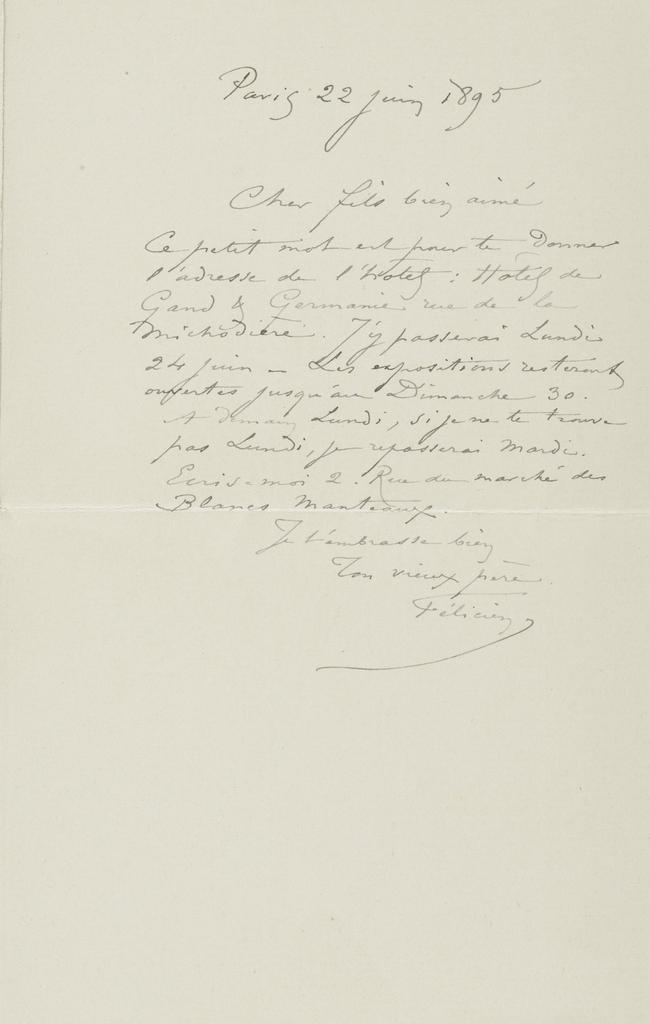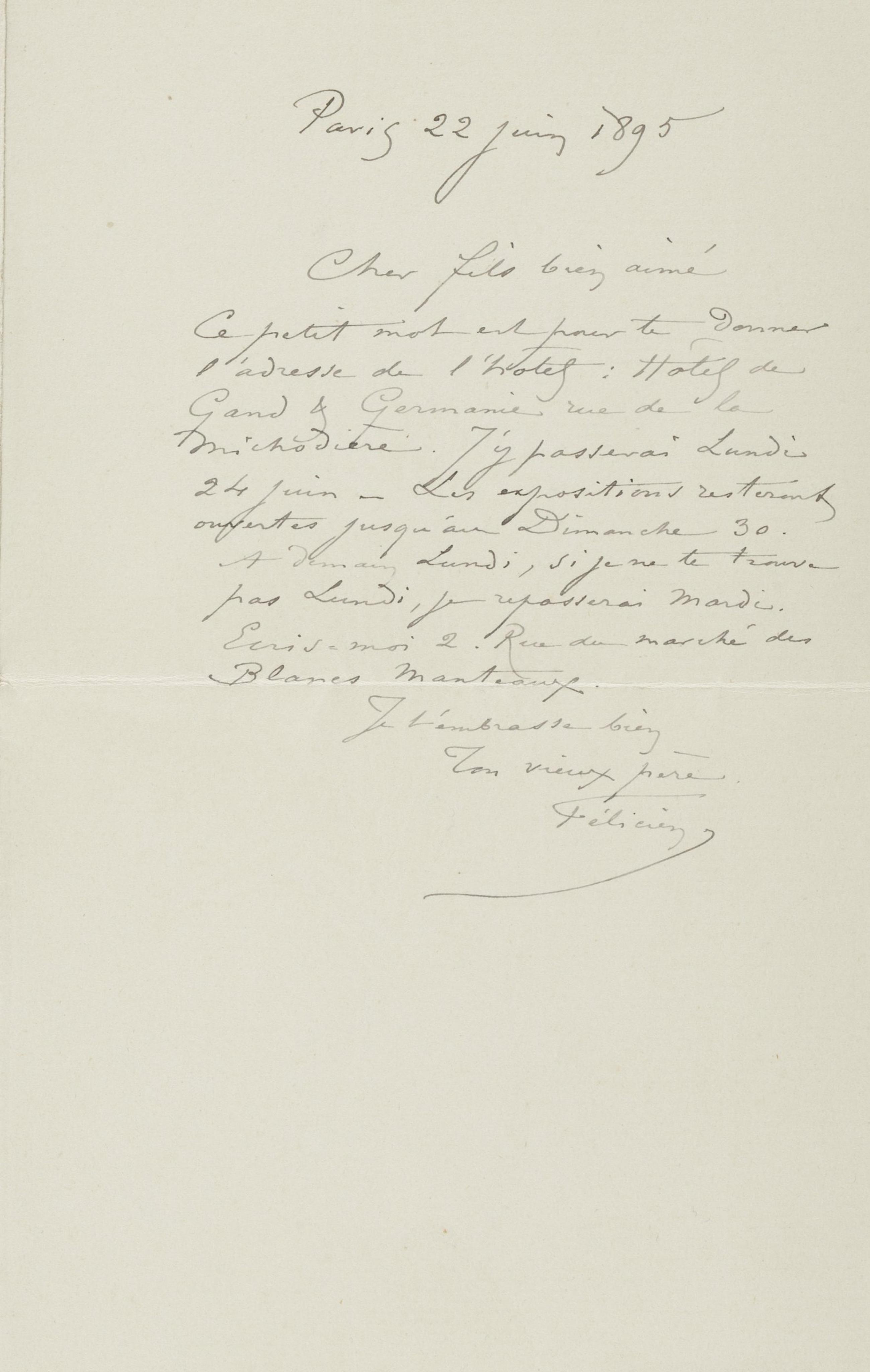Ce petit mot est pour te donner l’adresse de l’hôtel : Hôtel de Gand & Germanie rue de la Michodière. J’y passerai Lundi 24 juin – Les expositions resteront ouvertes jusqu’au Dimanche 30.