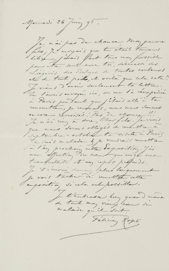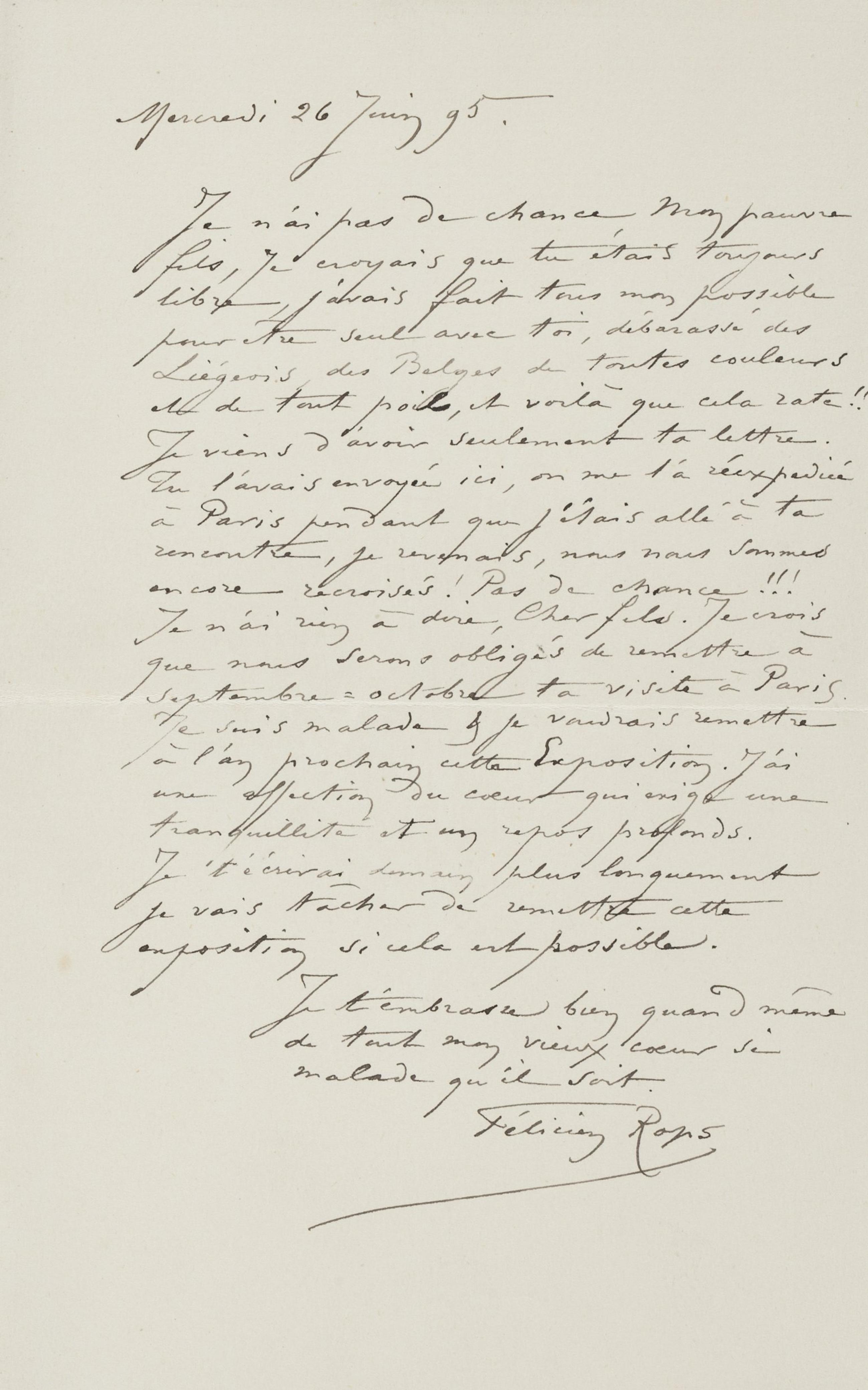 Je n’ai rien à dire, Cher fils. Je crois que nous serons obligés de remettre à septembre-octobre ta visite à Paris. Je suis malade & je voudrais remettre à l’an prochain cette Exposition. J’ai une affection du cœur qui exige une tranquillité et un repos profonds.
