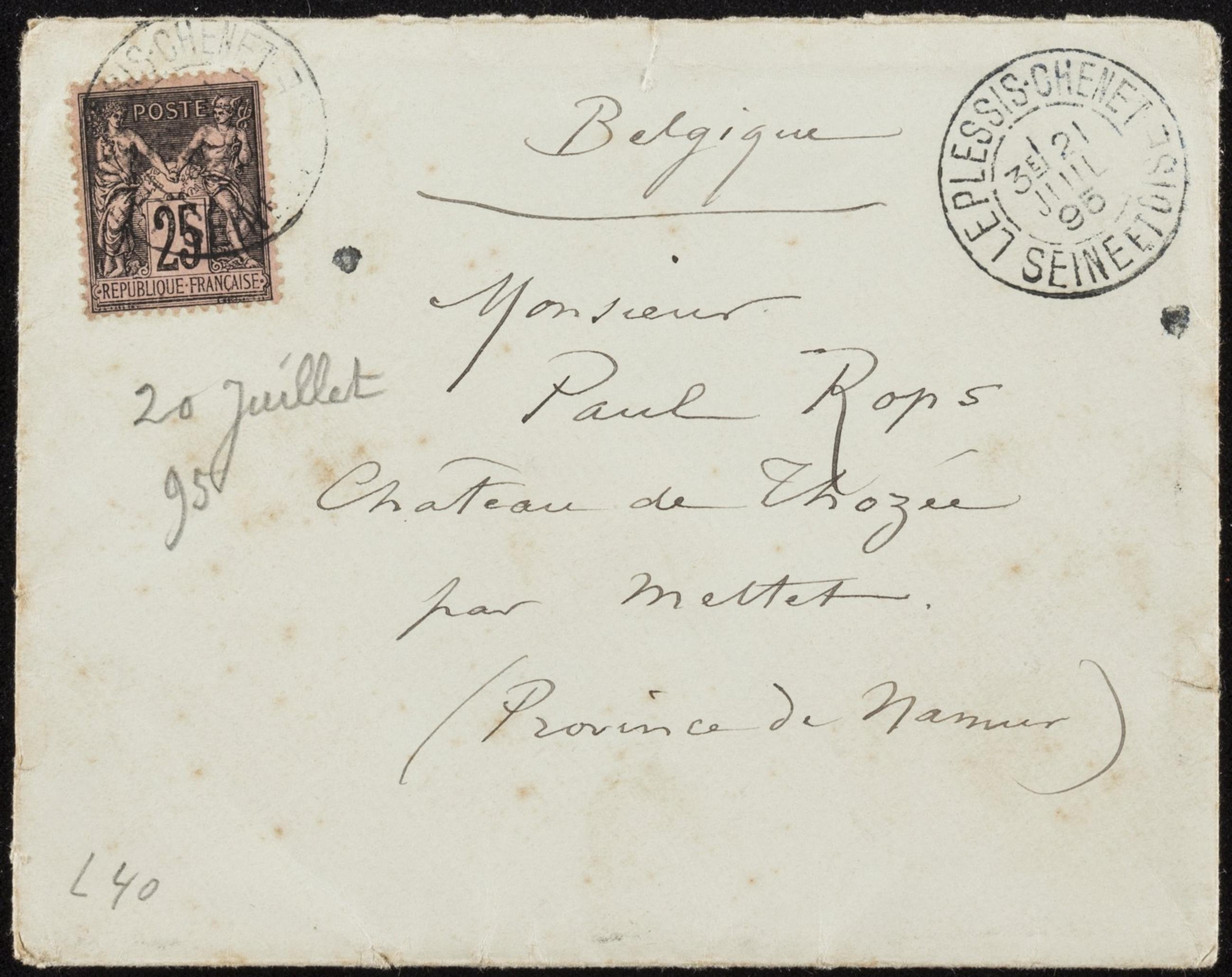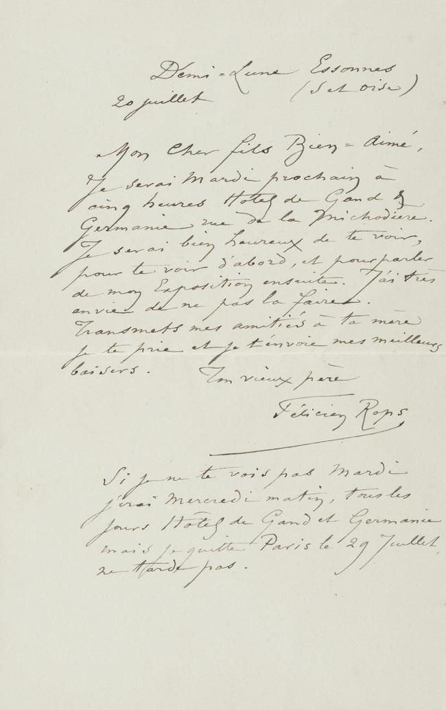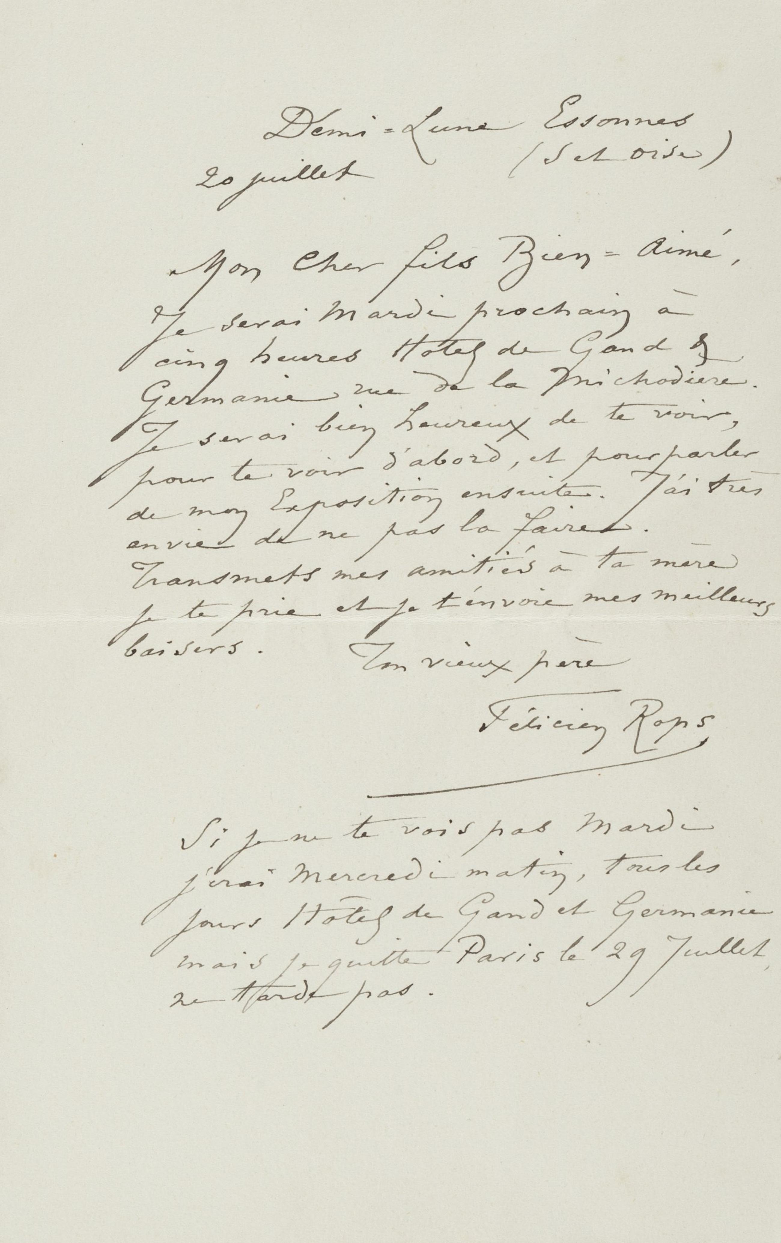 Si je ne te vois pas Mardi j’irai Mercredi matin, tous les jours Hôtel de Gand et Germanie mais je quitte Paris le 29 Juillet, ne tarde pas.
