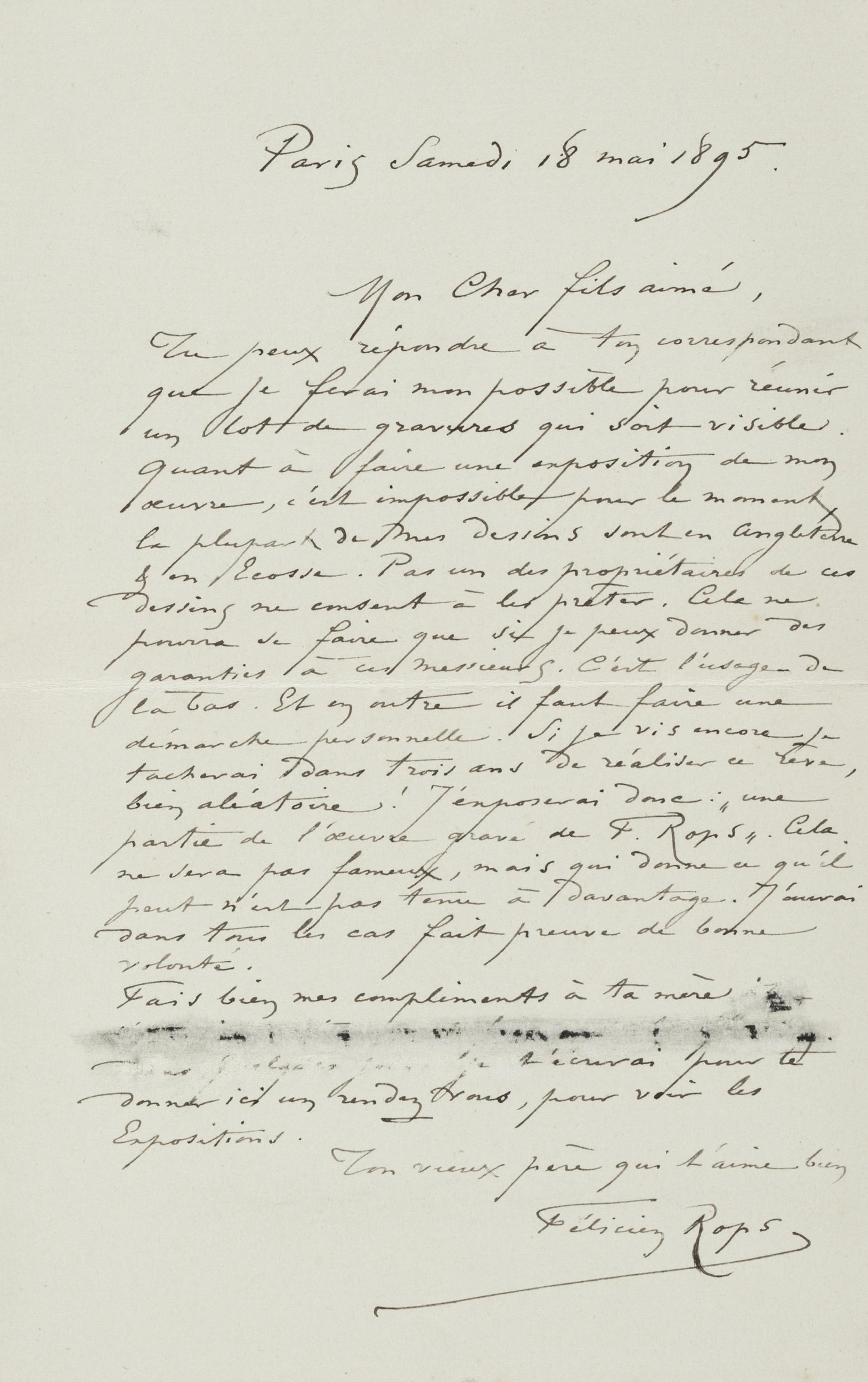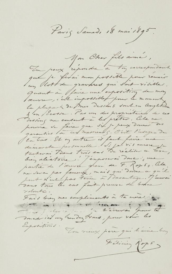 Tu peux répondre à ton correspondant que je ferai mon possible pour réunir un lot de gravures qui soit visible. Quant à faire une exposition de mon œuvre, c’est impossible pour le moment, la plupart de mes dessins sont en Angleterre & en Écosse. Pas un des propriétaires de ces dessins ne consent à les prêter. Cela ne pourra se faire que si je peux donner des garanties à ces messieurs. C’est l’usage de là bas. Et en outre il faut faire une démarche personnelle. Si je vis encore je tacherai dans trois ans de réaliser ce rêve bien aléatoire ! J’exposerai donc : « une partie de l’œuvre gravé de F. Rops ». Cela ne sera pas fameux, mais qui donne ce qu’il peut n’est pas tenu à davantage. J’aurai dans tous les cas fait preuve de bonne volonté.