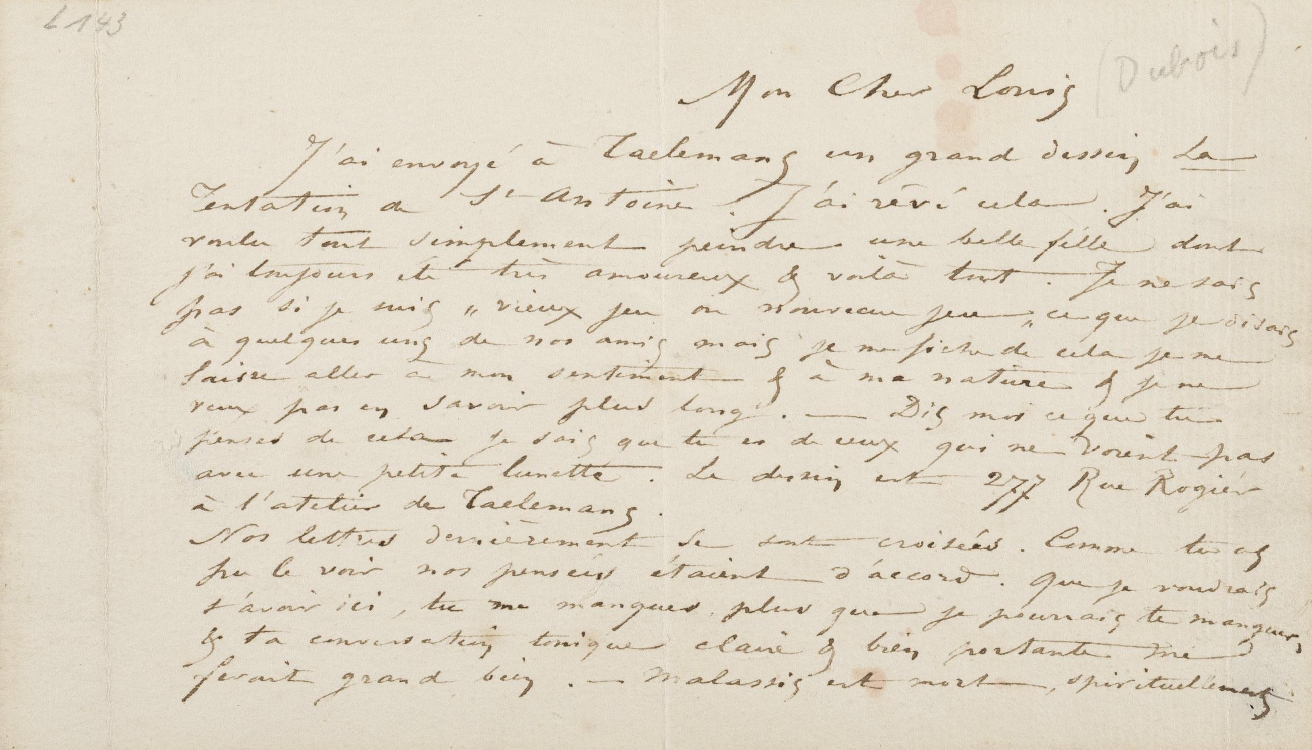 J’ai envoyé à Taelemans un grand dessin La Tentation de St Antoine. J’ai rêvé cela. J’ai voulu tout simplement peindre une belle fille dont j’ai toujours été très amoureux & voilà tout. Je ne sais pas si je suis « vieux jeu ou nouveau jeu » ce que je disais à quelques uns de nos amis mais je me fiche de cela je me laisse aller à mon sentiment & à ma nature & je ne veux pas en savoir plus long. – Dis moi ce que tu penses de cela Je sais que tu es de ceux qui ne voient pas avec une petite lunette. Le dessin est 277 Rue Rogier à l’atelier de Taelemans.