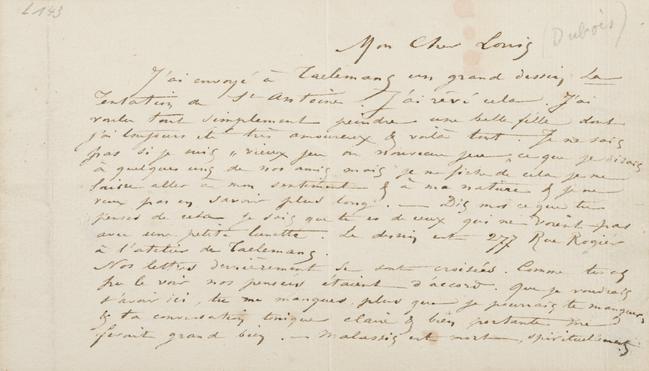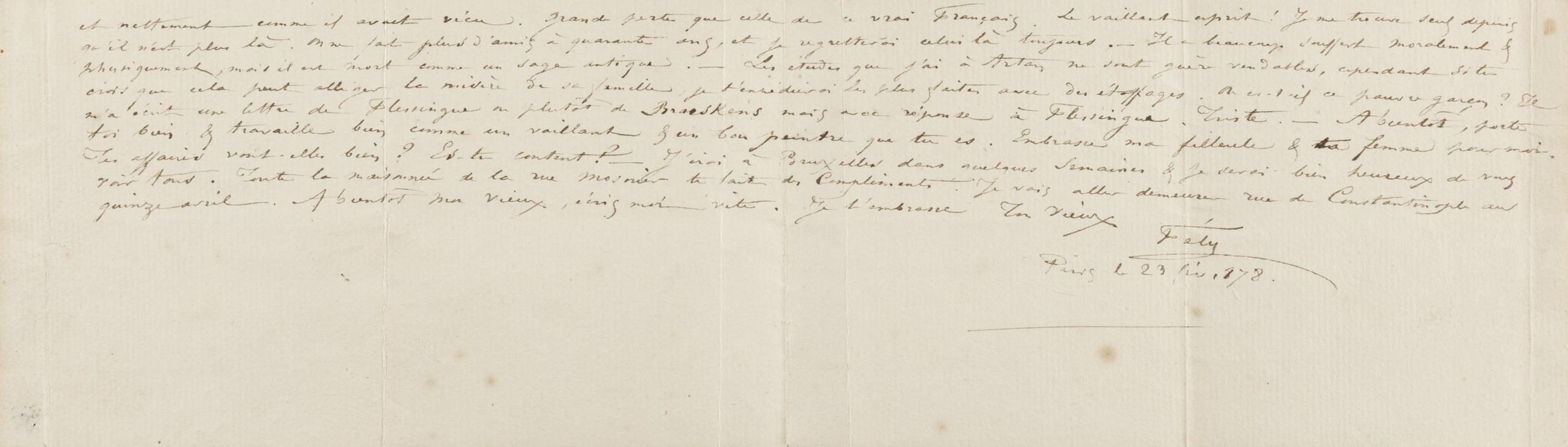 et nettement comme il avait vécu. Grande perte que celle de ce vrai Français. Le vaillant esprit ! Je me trouve seul depuis qu’il n’est plus là. On ne fait plus d’amis à quarante ans, et je regretterai celui là toujours. – Il a beaucoup souffert moralement & physiquement, mais il est mort comme un sage antique. – Les études que j’ai à Artan ne sont guère vendables, cependant si tu crois que cela peut alléger la misère de sa famille, je t’expédierai les plus faites avec des étoffages. Où es-t-il ce pauvre garçon ? Il m’a écrit une lettre de Flessingue ou plutôt de Braeskens mais avec réponse à Flessingue. Triste. – À bientôt, porte toi bien & travaille bien comme un vaillant & un bon peintre que tu es. Embrasse ma filleule & ta femme pour moi. Tes affaires vont-elles bien ? Es-tu content ? – J’irai à Bruxelles dans quelques semaines & je serai bien heureux de vous voir tous. Toute la maisonnée de la rue Mosnier te fait des Compliments. Je vais aller demeurer rue de Contantinople au quinze avril.