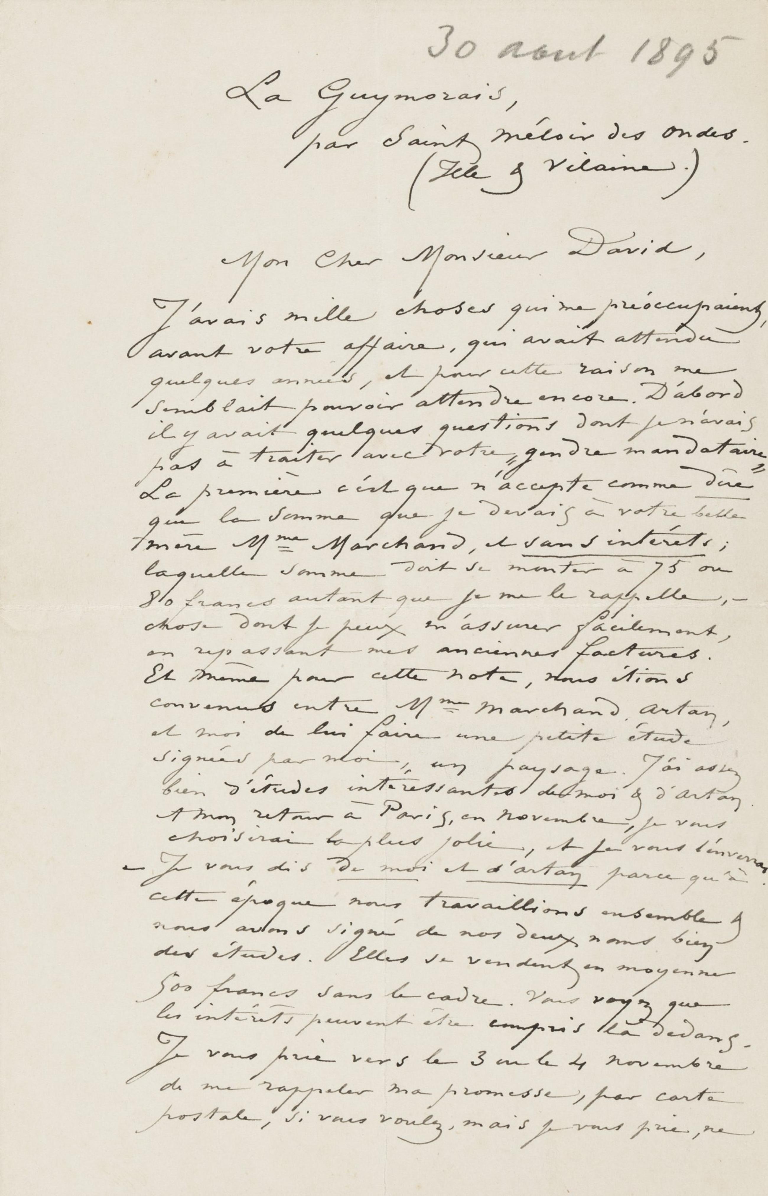 J’avais mille choses qui me préoccupaient, avant votre affaire, qui avait attendu quelques années, et pour cette raison me semblait pouvoir attendre encore. D’abord il y avait quelques questions dont je n’avais pas à traiter avec votre « gendre mandataire ». La première c’est que n’accepte comme dûe que la somme que je devais à votre belle mère Mme Marchand, et sans intérêts ; laquelle somme doit se monter à 75 ou 80 francs autant que je me le rappelle, – chose dont je peux m’assurer facilement, en repassant mes anciennes factures. Et même pour cette note, nous étions convenus entre Mme Marchand, Artan, et moi de lui faire une petite étude signées par moi, un paysage. J’ai assez bien d’études intéressantes de moi & d’Artan. À mon retour à Paris, en novembre, je vous choisirai la plus jolie, et je vous l’enverrai – Je vous dis de moi et d’Artan parce qu’à cette époque nous travaillions ensemble & nous avons signé de nos deux noms bien des études. Elles se vendent en moyenne 500 francs sans le cadre. Vous voyez que les intérêts peuvent être compris là dedans. Je vous prie vers le 3 ou 4 novembre de me rappeler ma promesse, par carte postale, si vous voulez, mais je vous prie, ne