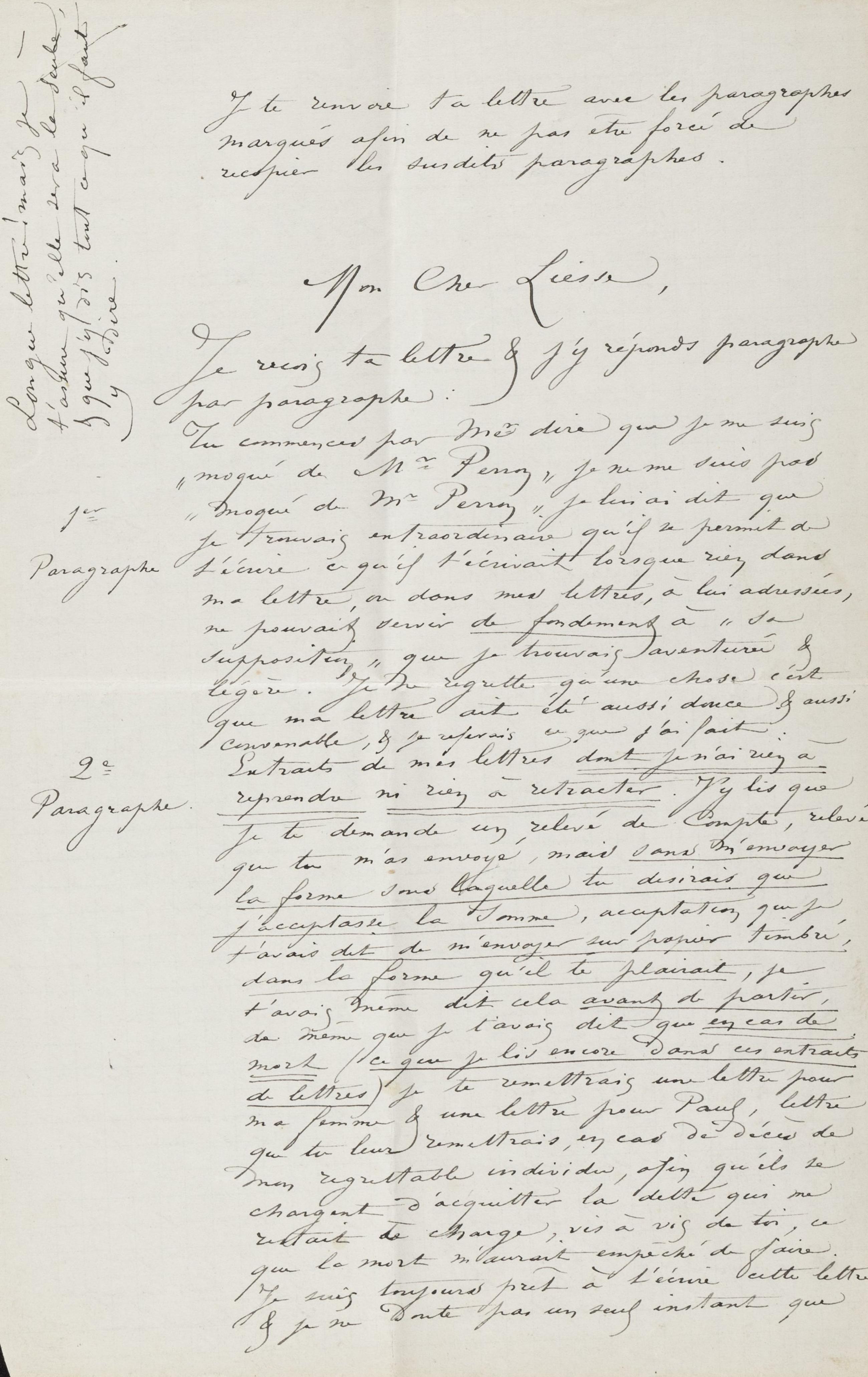 Tu commences par me dire que je me suis « moqué de Mr Perron » je ne me suis pas « moqué de Mr Perron ». je lui ai dit que je trouvais extraordinaire qu’il se permit de t’écrire ce qu’il t’écrivait lorsque rien dans ma lettre, ou dans mes lettres, à lui adressées, ne pouvait servir de fondement à « sa supposition » que je trouvais aventurée & légère. Je ne regrette qu’une chose c’est que ma lettre ait été aussi douce & aussi convenable, & je referais ce que j’ai fait.