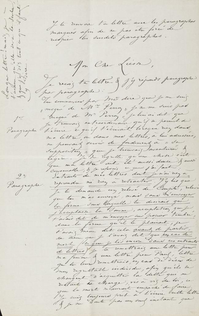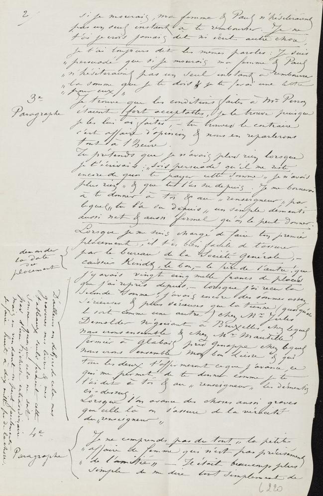 Tu prétends que je n’avais plus rien lorsque je t’écrivais : « Sois persuadé qu’il me reste encore de quoi te payer cette Somme » je n’avais plus rien » & que tu l’as su depuis. Je me bornerai à te donner à toi & au « renseigneur » par lequel « tu l’a su depuis » un simple démenti aussi net & aussi formel qu’on le peut donner. Lorsque je me suis chargé de faire ton premier placement, il t’es bien facile de t’assurer par le bureau de la Société Générale, – caissier Kindt, le bon, – le frère de l’autre !