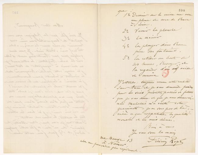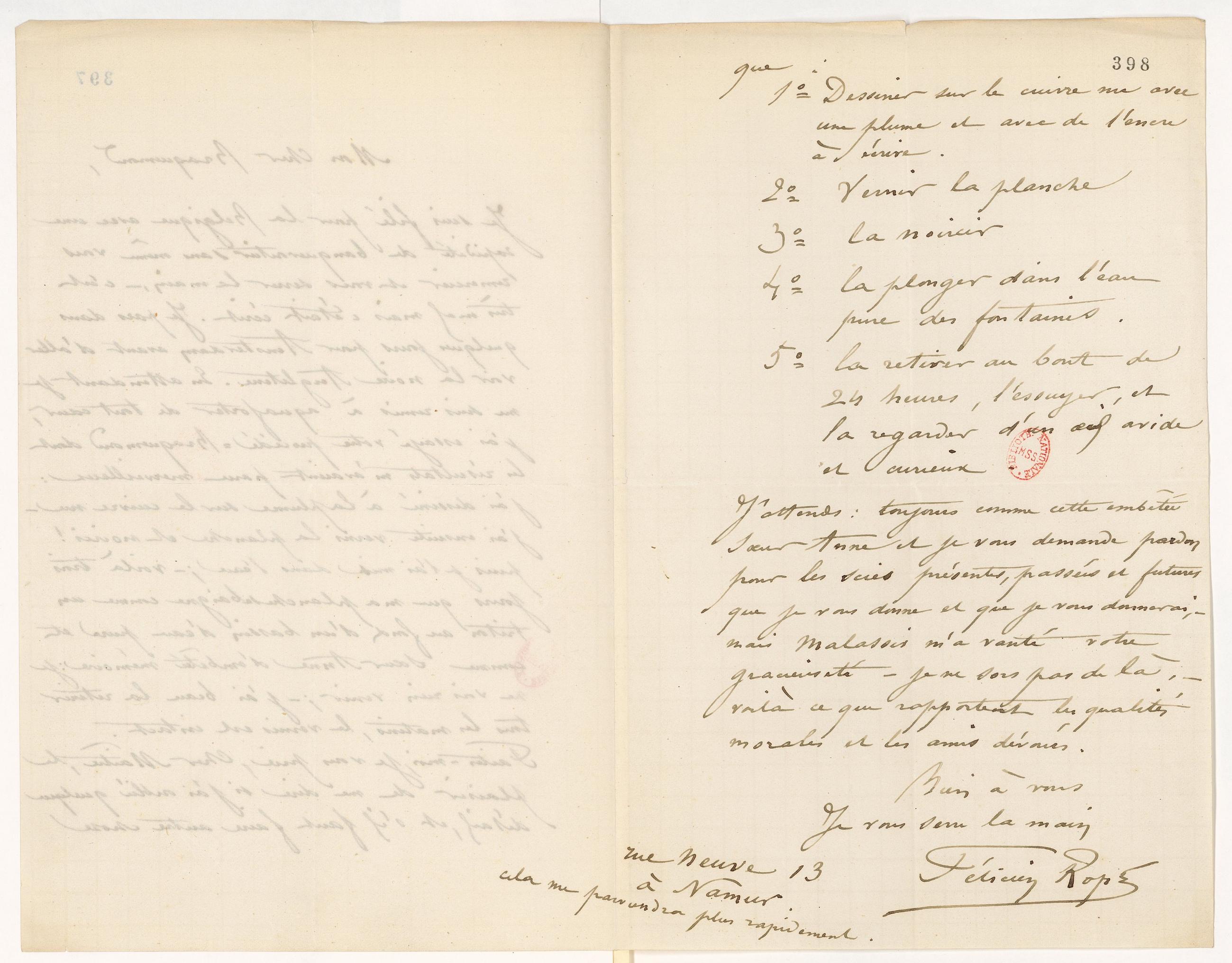 Je suis filé pour la Belgique avec une rapidité de banqueroutier sans même vous remercier et vous serrer la main, – c’est très mal mais c’était écrit. Je pars dans quelques jours pour Amsterdam avant d’aller voir la noire Angleterre. En attendant je me suis remis à aquaforter de tout cœur, j’ai essayé votre procédé-Braquemond dont les résultats m’avaient paru merveilleux : j’ai dessiné à la plume sur le cuivre nu – j’ai ensuite verni la planche et noirci ! puis je l’ai mis dans l’eau ; – voilà trois jours que ma planche se baigne comme un triton au fond d’un bassin d’eau pure et comme sœur Anne d’embêtée mémoire : je ne vois rien venir ; – j’ai beau la retirer tous les matins, le vernis est intact.