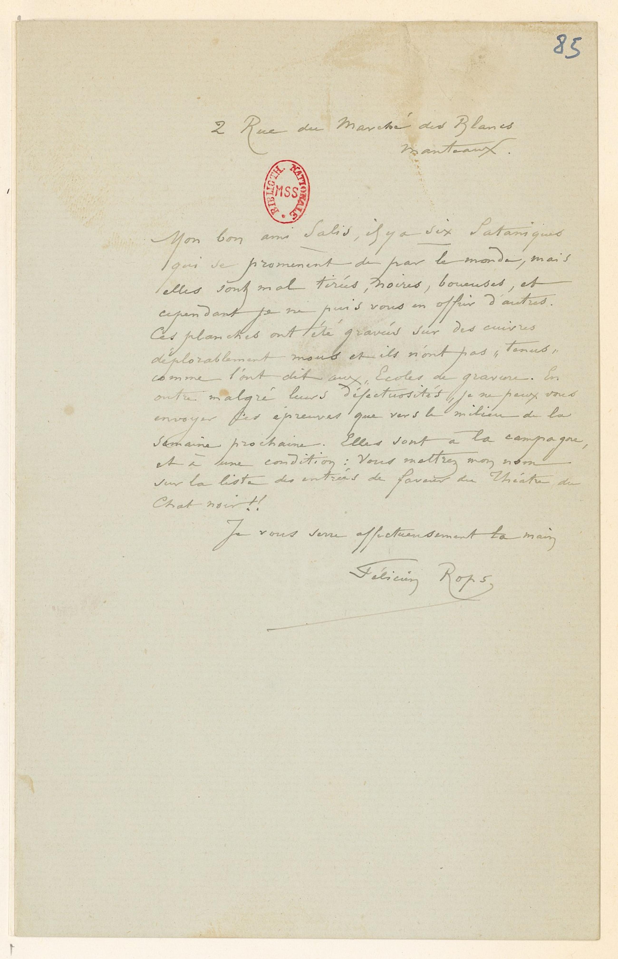 il y a sixSataniques qui se promènent de par le monde, mais elles sont mal tirées, noires, boueuses, et cependant je ne puis vous en offrir d’autres. Ces planches ont été gravées sur des cuivres déplorablement mous et ils n’ont pas « tenus » comme l’on dit aux « Écoles de gravure. En outre malgré leurs défectuosités, je ne peux vous envoyer ces épreuves que vers le milieu de la semaine prochaine. Elles sont à la campagne, et à une condition : vous mettrez mon nom sur la liste des entrées de faveur du Théatre du Chat noir !!