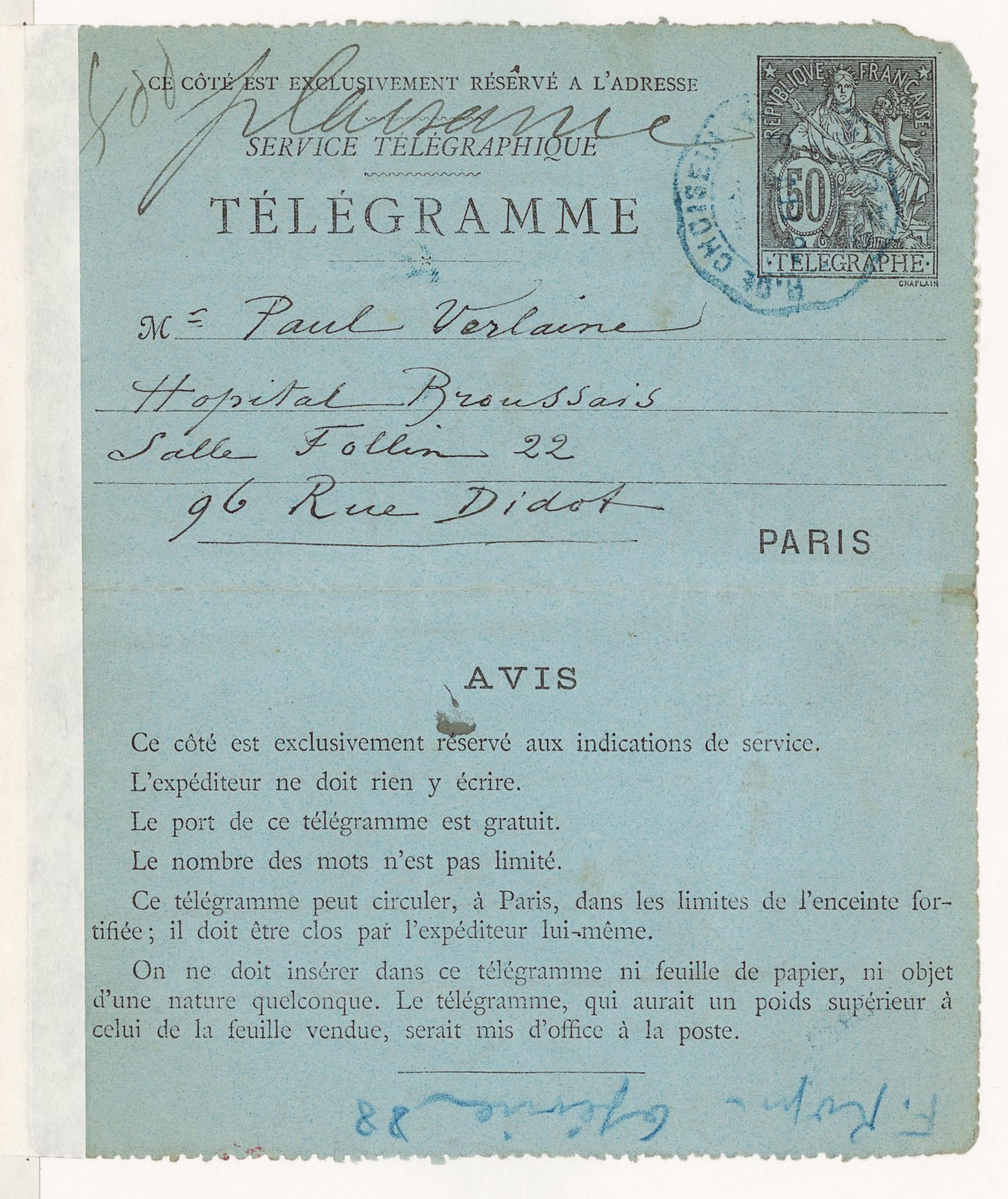 Mr Paul VerlaineHopital BroussaisSalle Follin 2296 Rue Didot Page 1 Verso : 2