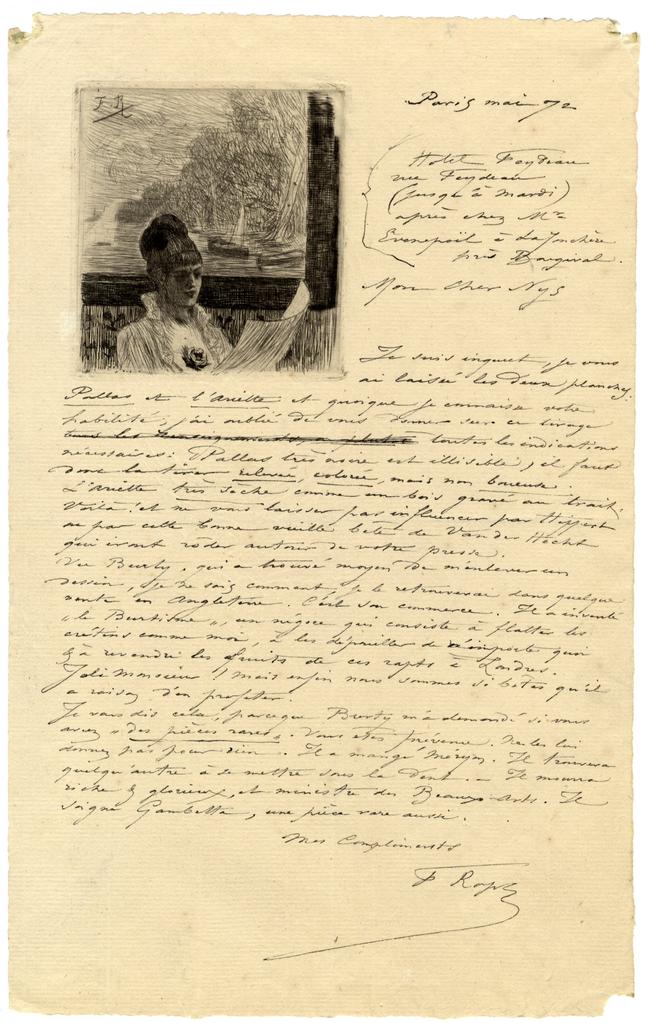 Je suis inquiet, je vous ai laissé les deux planches : Pallas et l’Ariette et quoique je connaisse votre habilité ; j’ai oublier de vous donner sur ce tirage tous les renseignements, ou toutes les indications nécessaires : Pallas très noire est illisible, il faut donc la tirer relevée, colorée, mais non boueuse.