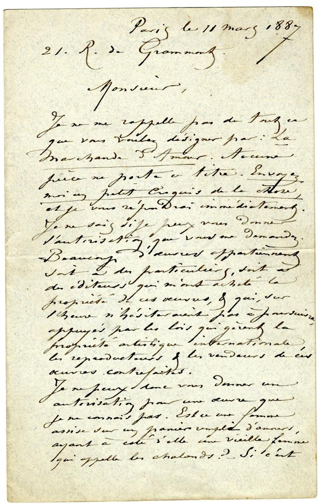 Je ne me rappelle pas du tout ce que vous voulez désigner par : La Marchande d’Amour. Aucune pièce ne porte ce titre. Envoyez moi un petit croquis de la chose, et je vous répondrai immédiatement. Je ne sais si je peux vous donner l’autorisation que vous me demandez. Beaucoup d’œuvres appartiennent soit à des particuliers, soit à des éditeurs qui m’ont acheté la propriété de ces œuvres, & qui, sur l’heure n’hésiteraient pas à poursuivre, appuyés par les lois qui gèrent la propriété artistique internationale, les reproducteurs, & les vendeurs de ces œuvres contrefaites.