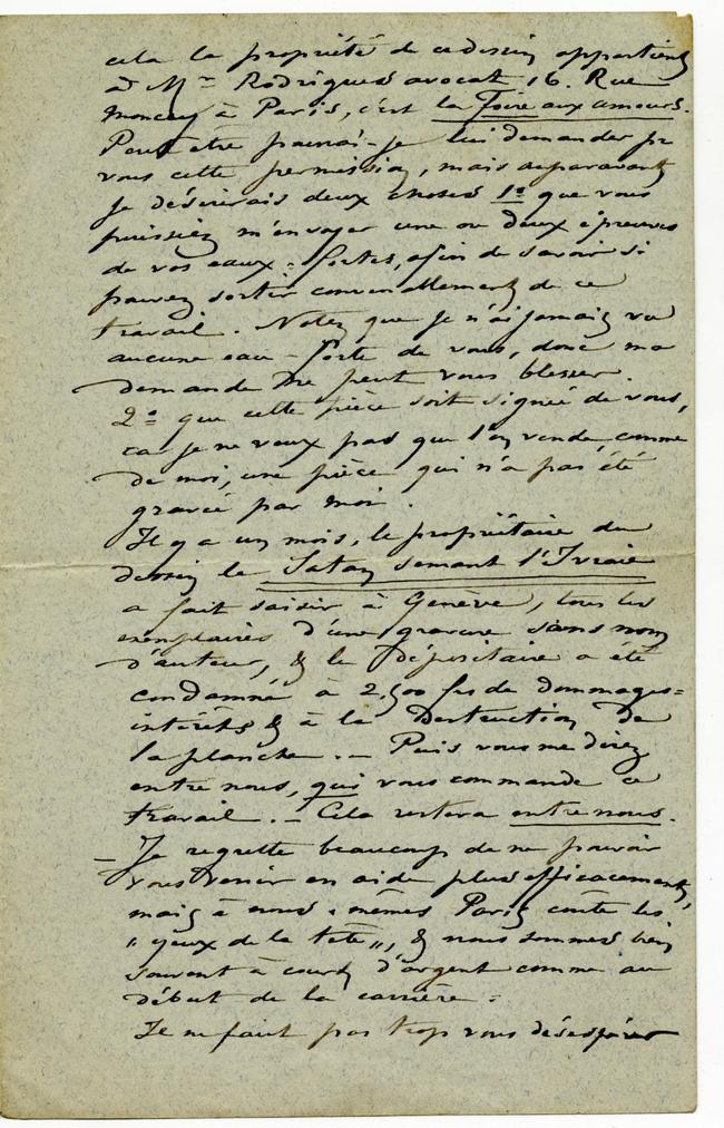 cela la propriété de ce dessin appartient à Mr Rodrigues avocat 16. Rue Moncey à Paris, c’est la Foire aux amours. Peut être pourrai-je lui demander pour vous cette permission, mais auparavant je désirerais deux choses 1° que vous puissiez m’envoyer une ou deux épreuves de vos eaux-fortes, afin de savoir si pouvez sortir convenablement de ce travail. Notez que je n’ai jamais vu aucune eau-forte de vous, donc ma demande ne peut vous blesser.