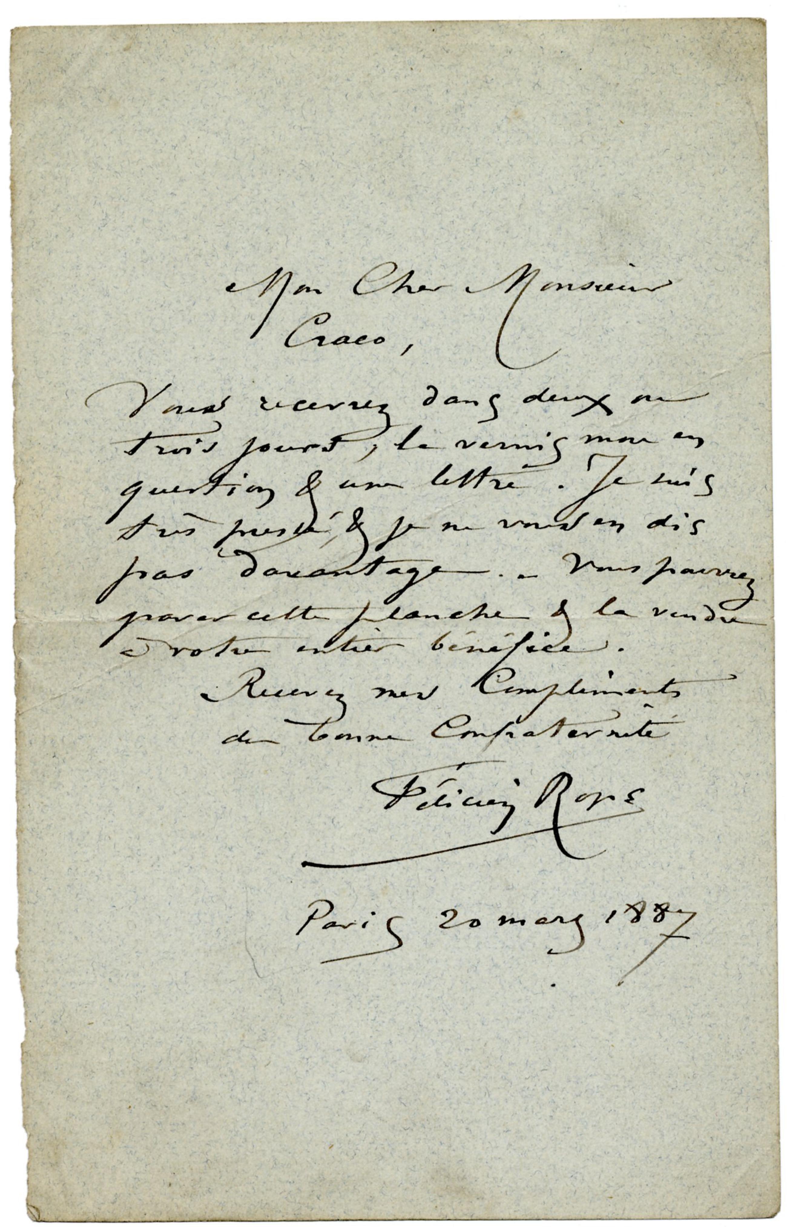 Vous recevrez dans deux ou trois jours, le vernis mou en question & une lettre. Je suis très pressé, & je ne vous en dis pas davantage. – Vous pourrez graver cette planche & la vendre à votre entier bénéfice.