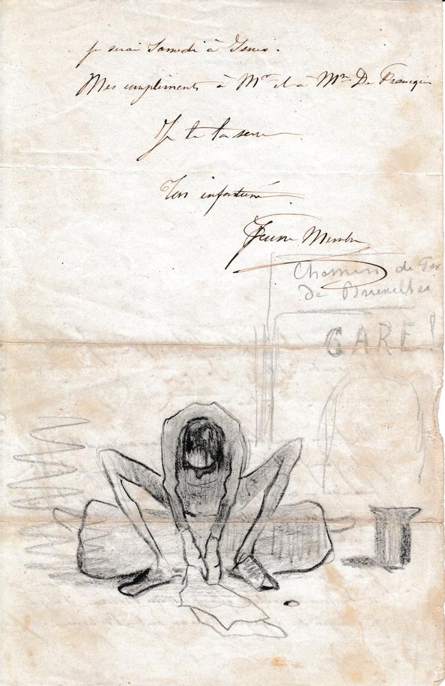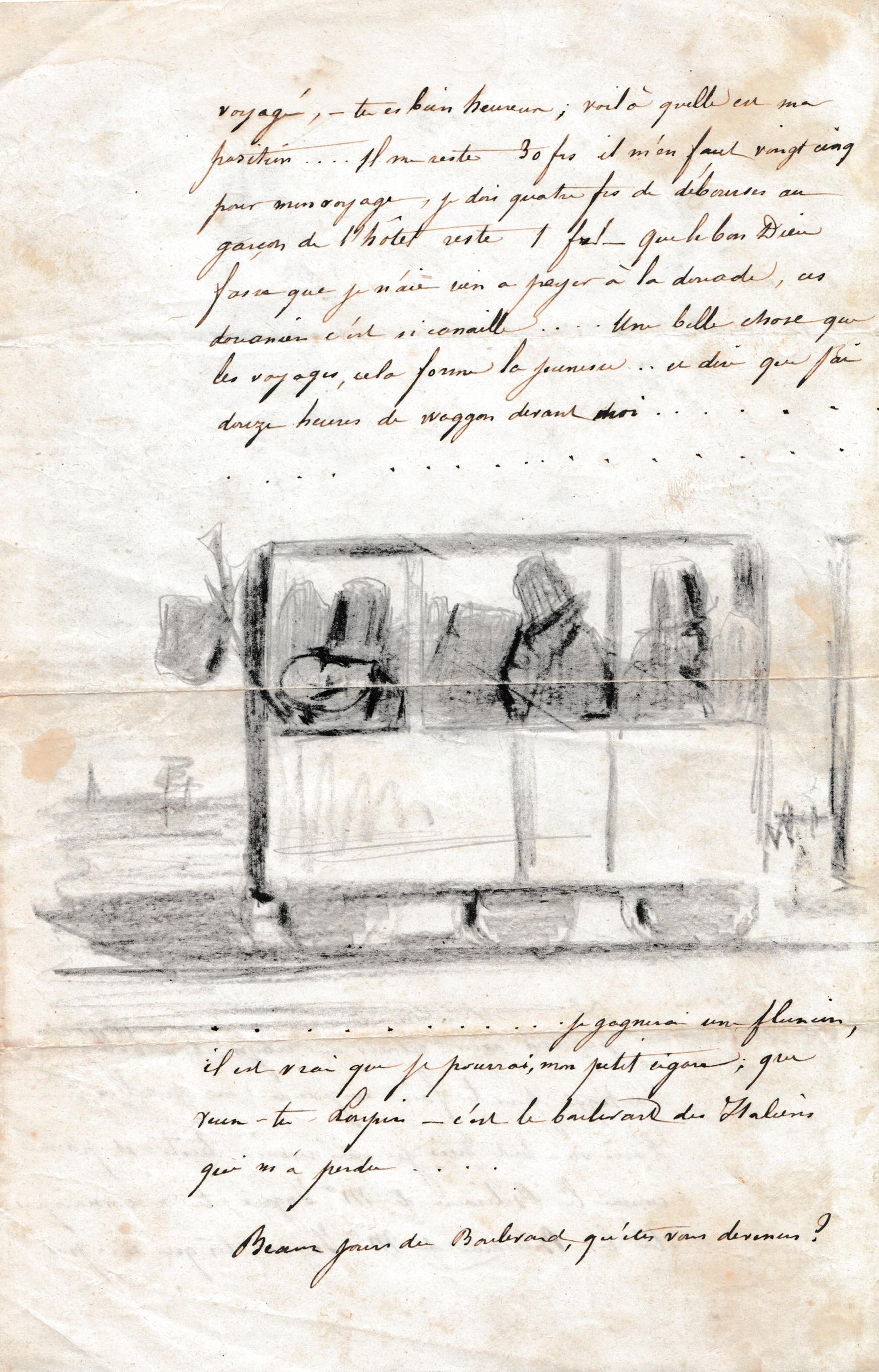 voyagé, ‒ tu es bien heureux ; voilà quelle est ma position…. il me reste 30 frs il m’en faut vingt cinq pour mon voyage, je dois quatre frs de débourses au garçon de l’hôtel reste 1 fr ! – Que le bon Dieu fasse que je n’aie rien à payer à la douane, ces douaniers c’est si canaille…. Une belle chose que les voyages, cela forme la jeunesse… et dire que j’ai douze heures de waggon devant moi……………………