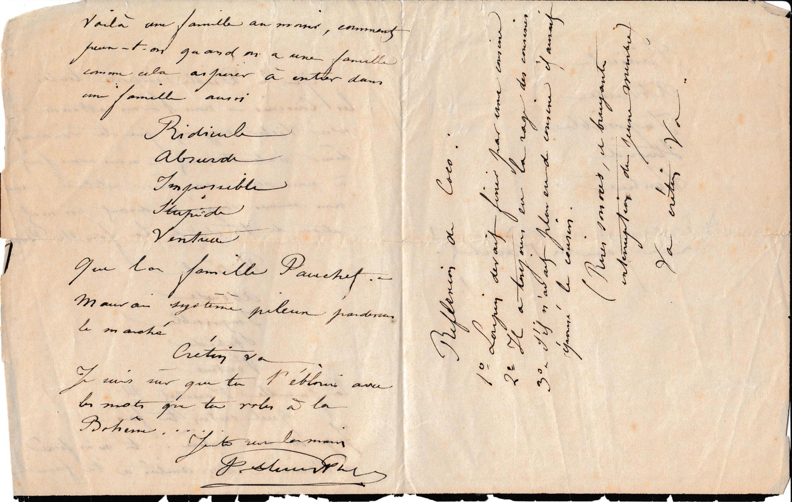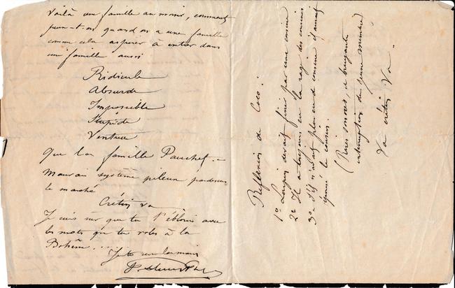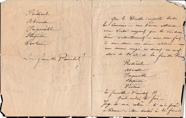 Que le Diable emporte toutes les Cousines ‒ nous t’avons attendu avec Victor croyant que tu viendrais dîner naturellement ‒ nous avons fait à nous deux un dîner solitaire ‒ nous nous sommes vengés en disant un mal atroce de toi et de la famille Pauchet