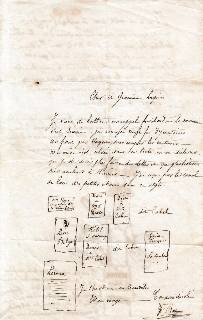 Un franc par blague sans compter les centimes ‒ Ma mère s’est retirée de sa tente, en me déclarant que je ne devais plus faire de dettes et que j’achèterais mes couleurs à Namur ‒ J’ai reçu par le canal de Coco des petites choses dans ce style.
