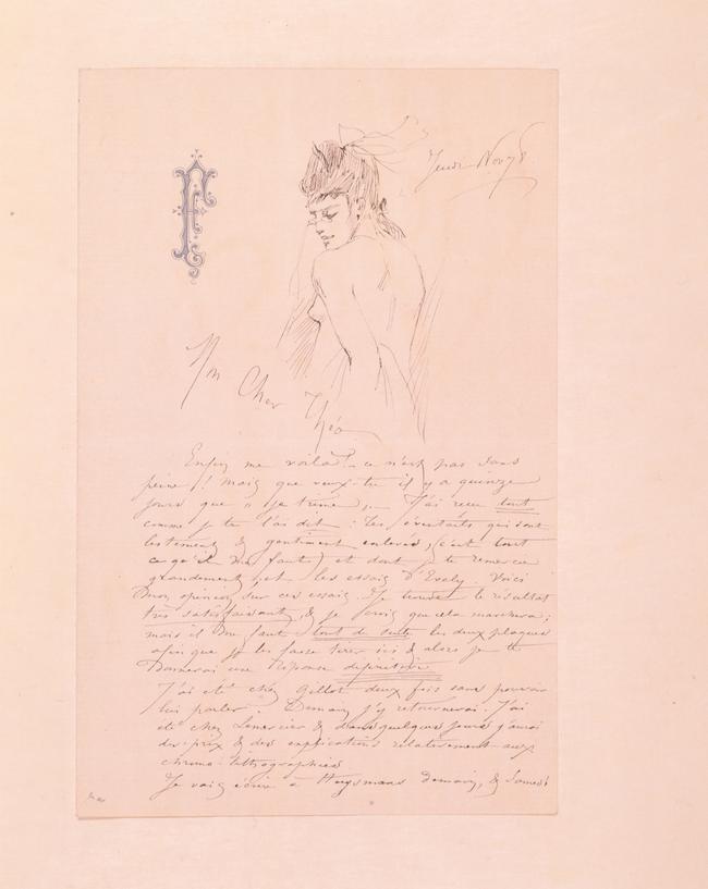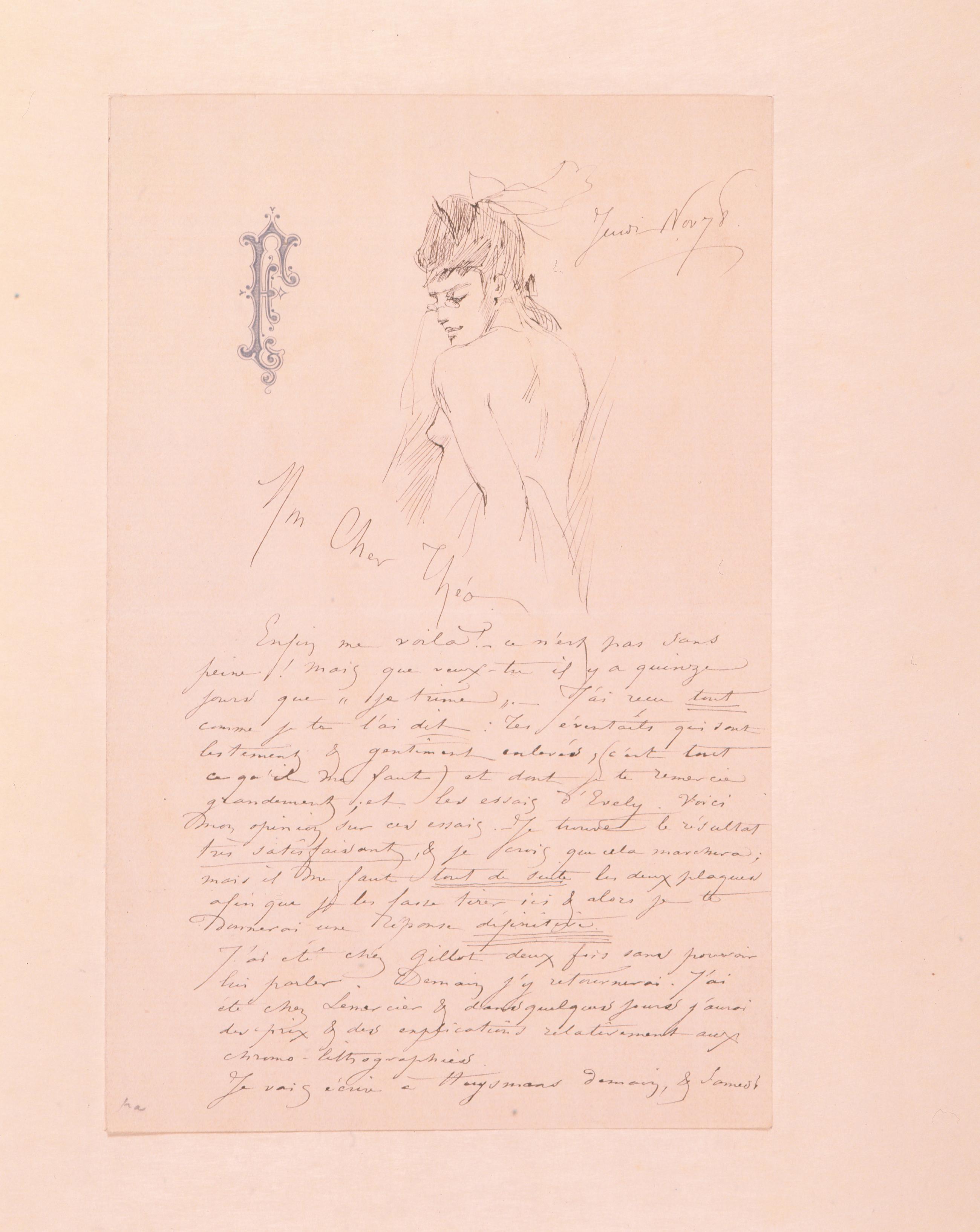Enfin me voilà ! – ce n’est pas sans peine ! Mais que veux-tu il y a quinze jours que « je trime ». – J’ai reçu tout comme je te l’ai dit : Tes éventails qui sont lestement & gentîment enlevés, (c’est tout ce qu’il me faut) et dont je te remercie grandement ; et les essais d’Evely. Voici mon opinion sur ces essais. – Je trouve le résultat très satisfaisant, & je crois que cela marchera ; mais il me faut tout de suite les deux plaques afin que je les fasse tirer ici & alors je te donnerai une réponse définitive.