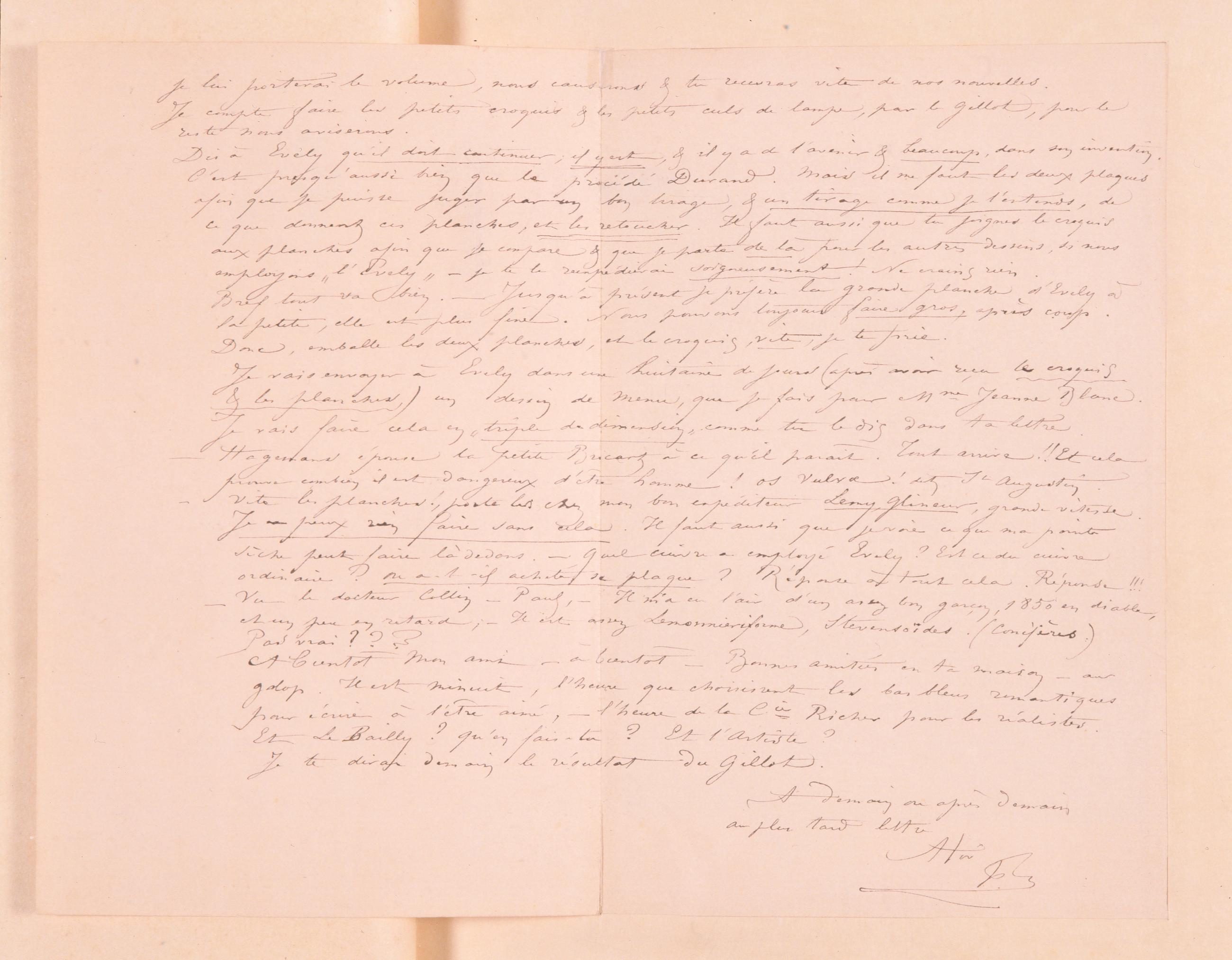 Dis à Evelyqu’il doit continuer ; il y est, & il y a de l’avenir & beaucoup, dans son invention. C’est presqu’aussi bien que le procédé Durand. Mais il me faut les deux plaques afin que je puisse juger par un bon tirage, & un tirage comme je l’entends, de ce que donnent ces planches, et les retoucher. Il faut aussi que tu joignes le croquis aux planches afin que je compare & que je parte de là pour les autres dessins, si nous employons « l’Evely » – je te le reexpédierai soigneusement ! Ne crains rien.