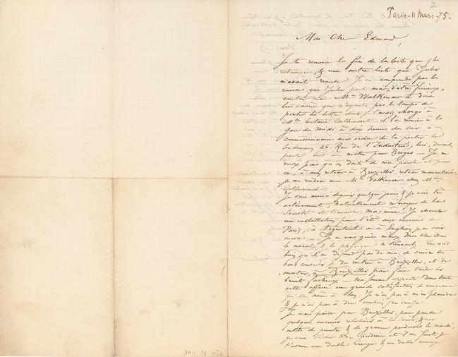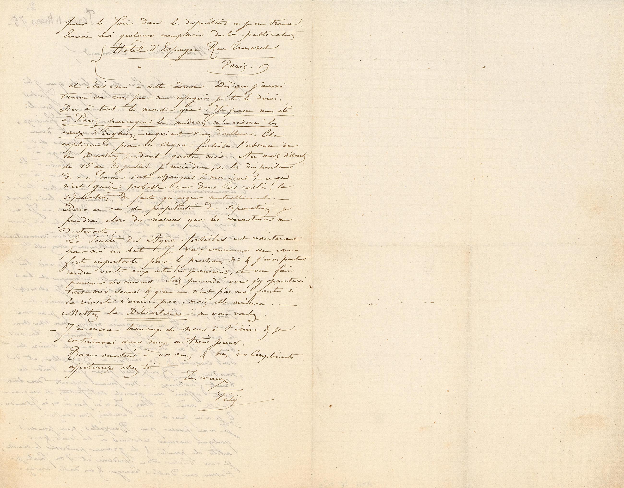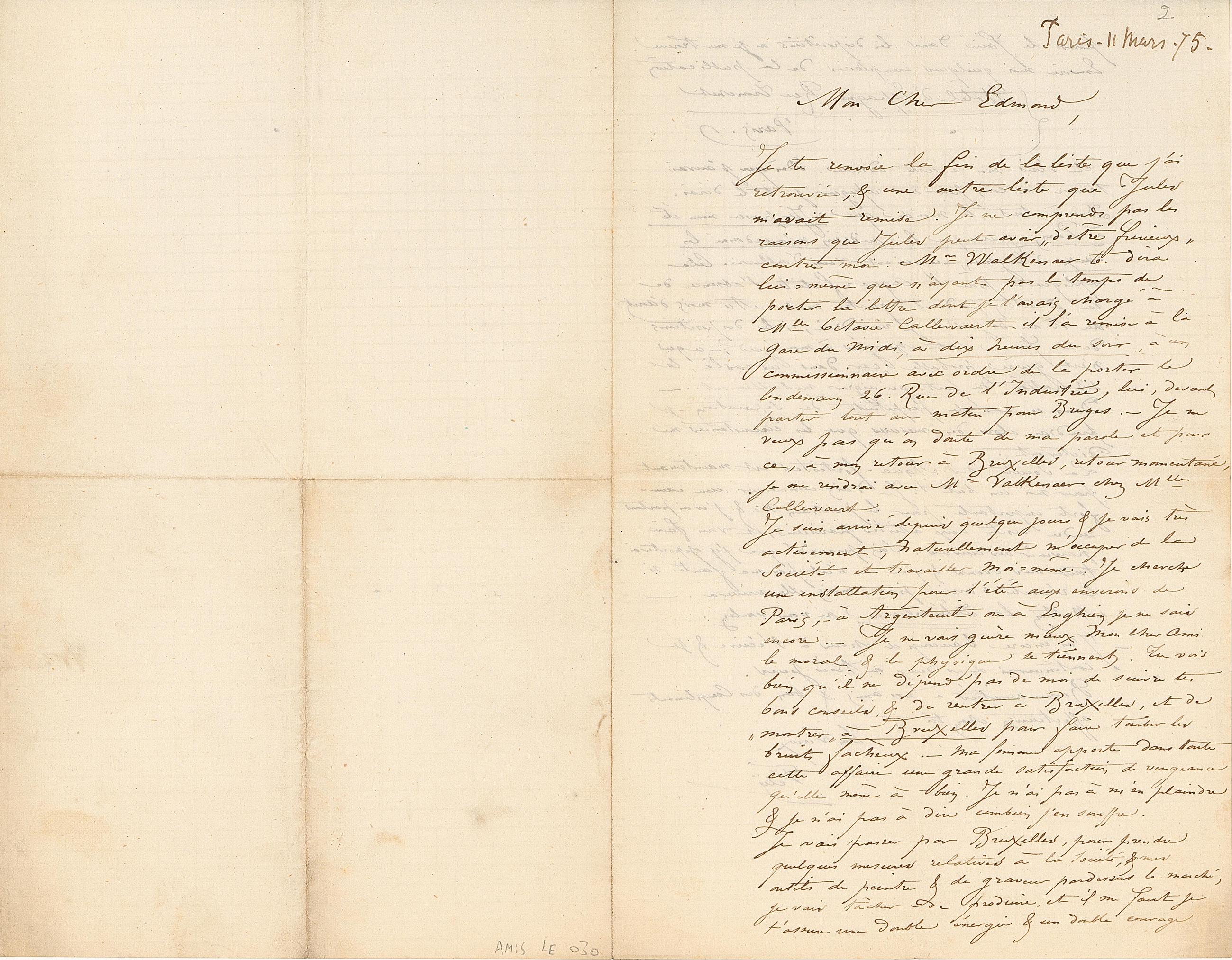 Je suis arrivé depuis quelques jours & je vais très activement, naturellement m’occuper de la Société et travailler moi-même. Je cherche une installation pour l’été aux environs de Paris, – à Argenteuil ou à Enghien je ne sais encore. – Je ne vais guère mieux Mon Cher Ami le moral & le physique se tiennent. Tu vois bien qu’il ne dépend pas de moi de suivre tes bons conseils, & de rentrer à Bruxelles, et de « montrer » à Bruxelles pour faire tomber les bruits fâcheux. – Ma femme apporte dans toute cette affaire une grande satisfaction de vengeance qu’elle mène à bien. Je n’ai pas à m’en plaindre & je n’ai pas à dire combien j’en souffre.