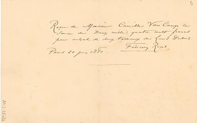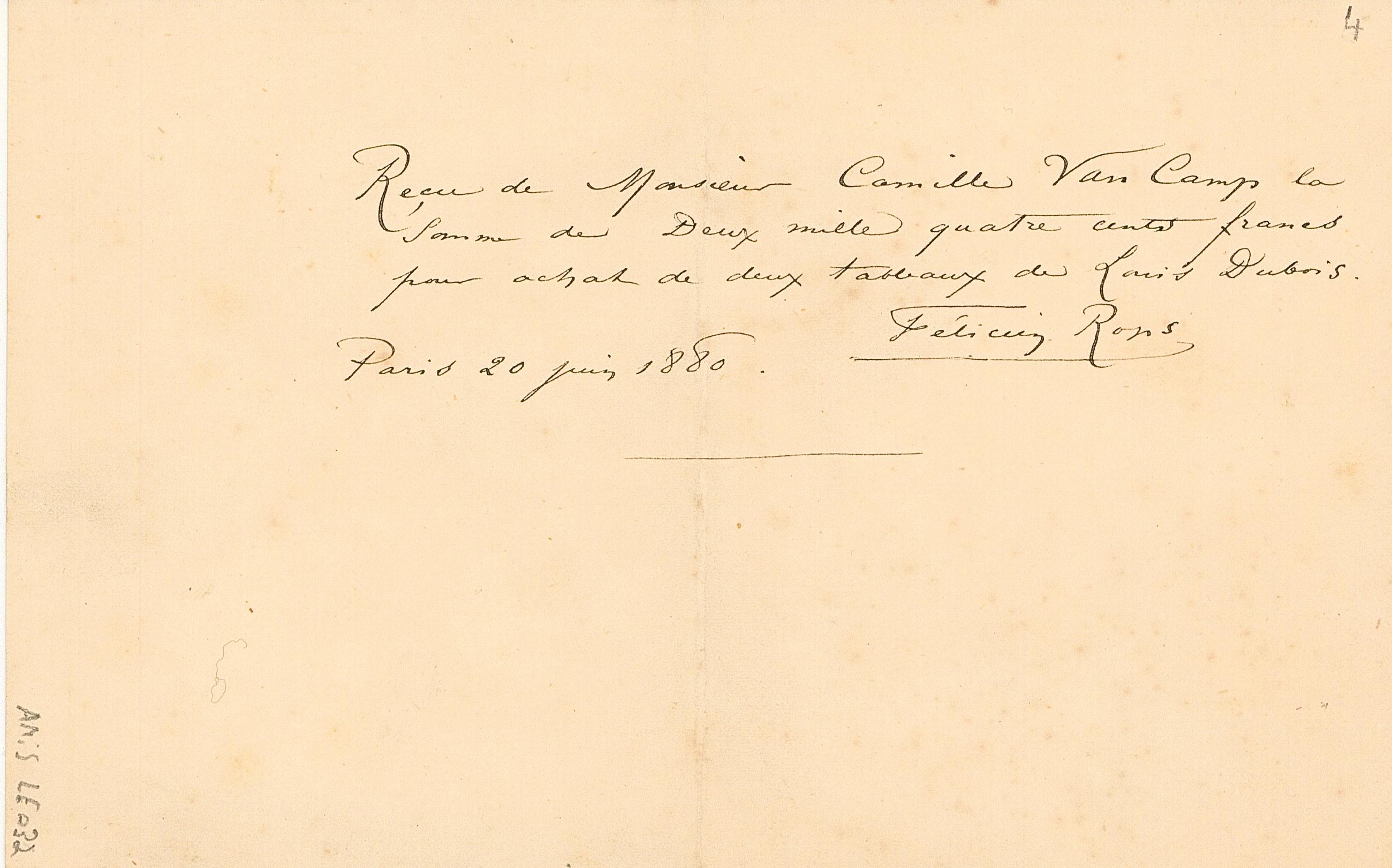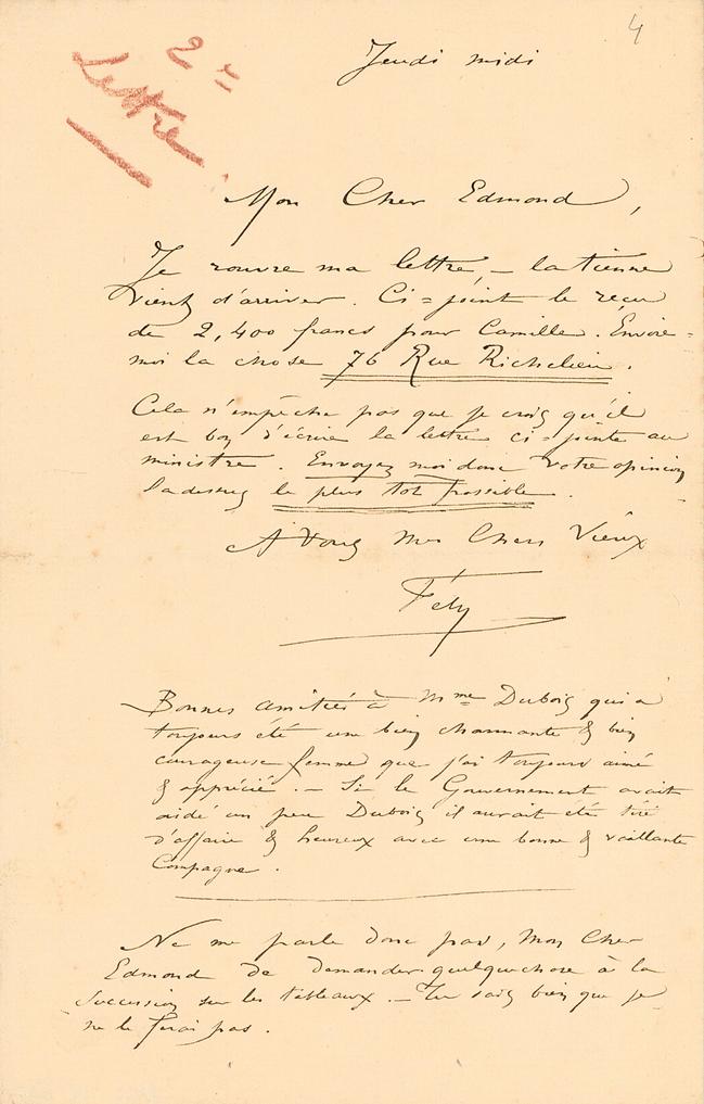 Je rouvre ma lettre, – la tienne vient d’arriver. Ci-joint le reçu de 2,400 francs pour Camille. Envoie-moi la chose 76 Rue Richelieu.