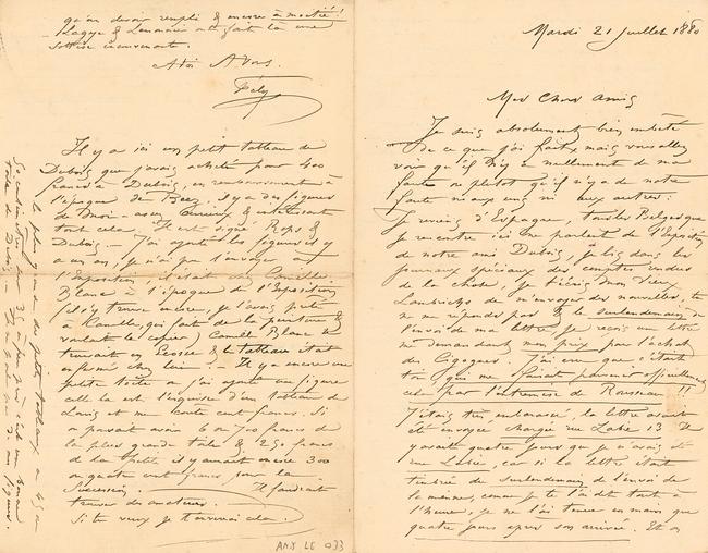 Il y a ici un petit tableau de Dubois que j’avais acheté pour 400 francs à Dubois, en remboursement à l’époque de Beez, il y a des figures de Moi – assez curieux & intéressant tout cela. Il est signé Rops & Dubois. – J’ai ajouté les figures il y a un an, je n’ai pu l’envoyer à l’Exposition, il était chez Camille Blanc à l’époque de l’Exposition (il s’y trouve encore, je l’avais prêté à Camille, qui fait de la peinture & voulait le copier) Camille Blanc se trouvait en Écosse & le tableau était enfermé chez lui. – Il y a encore une petite toile où j’ai ajouté une figure celle la est l’esquisse d’un tableau de Louis et me coûte cent francs. Si on pouvait avoir 6 ou 700 francs de la plus grande toile & 250 francs de la petite il y aurait encore 300 ou quatre cent francs pour la Succession. – Il faudrait trouver des amateurs. –